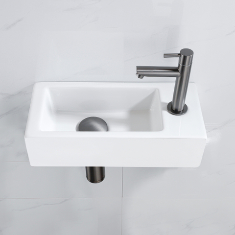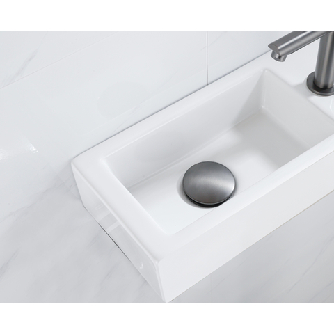 De QeramiQ Fuente Fonteinset straalt elegantie en stijl uit met zijn mat witte afwerking en strakke lijnen. Het keramische materiaal voegt een vleugje luxe toe aan de ruimte, terwijl het kraangat aan de rechterkant zorgt voor een handige en praktische indeling. De fonteinkraan in gunmetal voegt een eigentijdse touch toe aan het geheel, waardoor dit product een echte blikvanger is in elke badkamer.