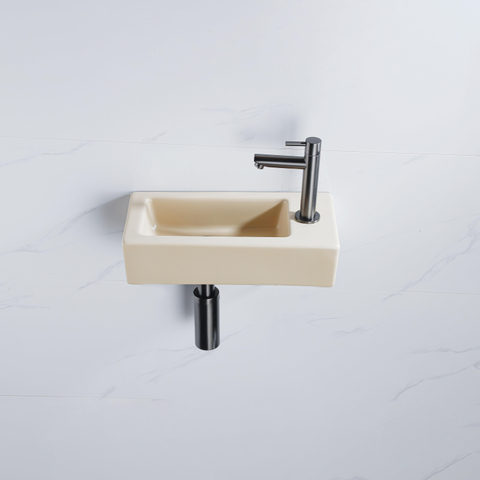 QeramiQ Fuente Fonteinset - 37.5x18.5x9cm - keramiek - kraangat rechts - fonteinkraan gunmetal - afvoerplug - verlaagd sifon - Mat Beige