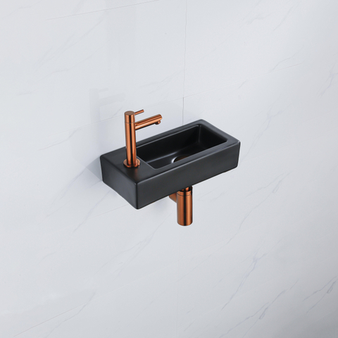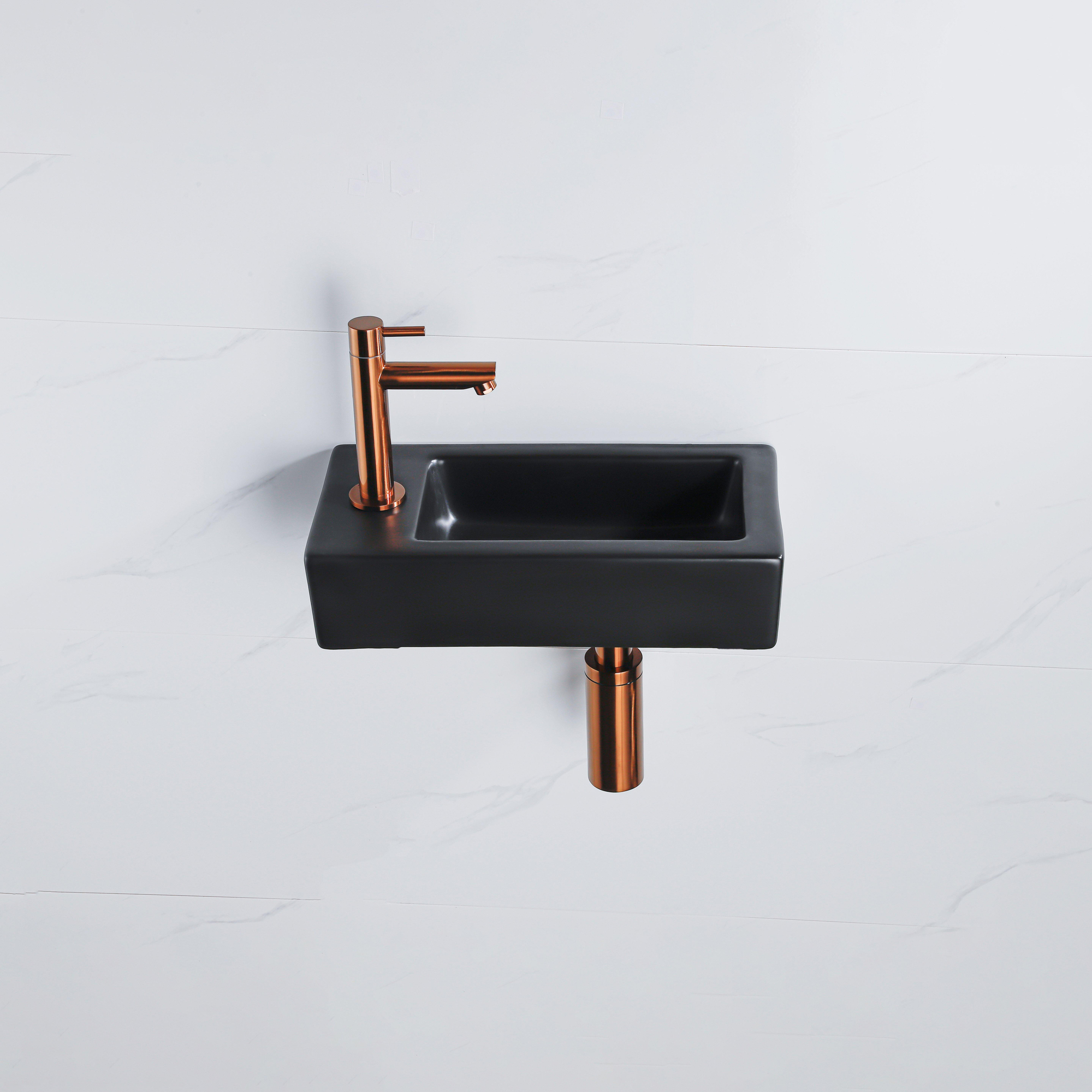 QeramiQ Fuente Fonteinset - 37.5x18.5x9cm - keramiek - kraangat links - fonteinkraan geborsteld koper - afvoerplug - verlaagd sifon - Mat Zwart