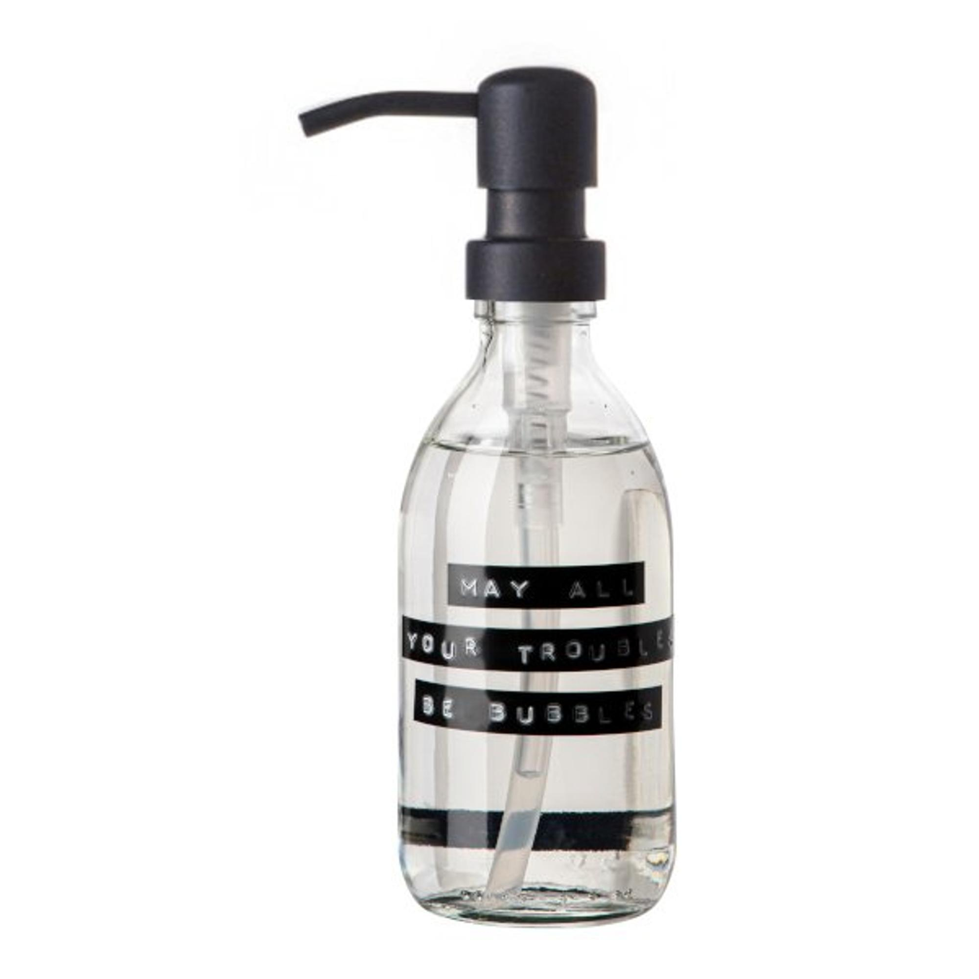 Wellmark Handzeep helder glas zwarte pomp 250ml tekst MAY ALL YOUR TROUBLES BE BUBBLES