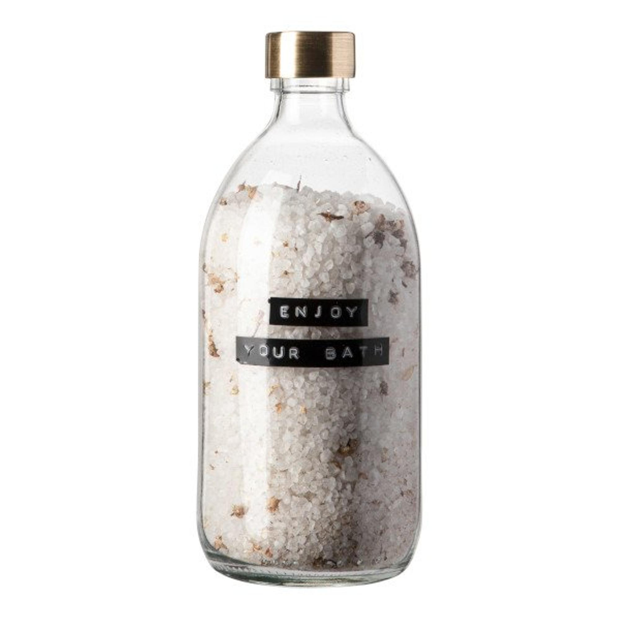 Wellmark Badzout helder glas messing dop 500ml Kamille tekst ENJOY YOUR BATH