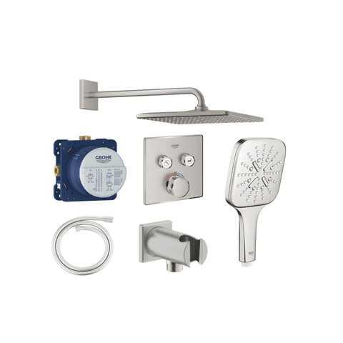 Grohe Grohtherm regendoucheset inbouw - hoofddouche vierkant - handdouche vierkant - gebogen wandarm - supersteel