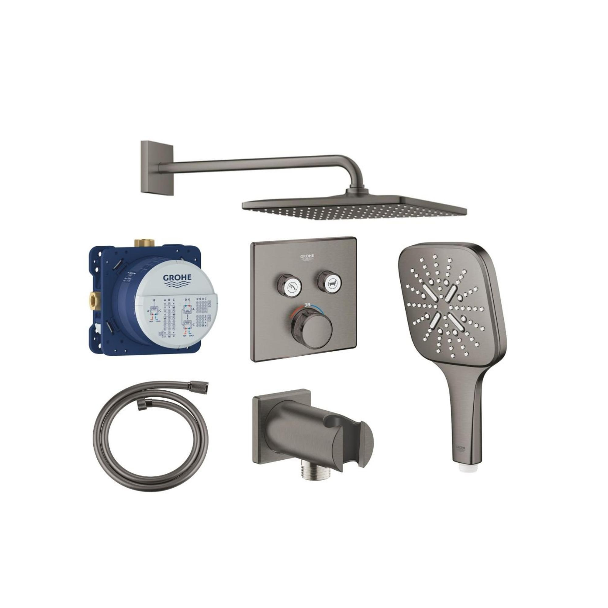 Grohe Grohtherm regendoucheset inbouw - hoofddouche vierkant - handdouche vierkant - gebogen wandarm - hard graphite geborsteld