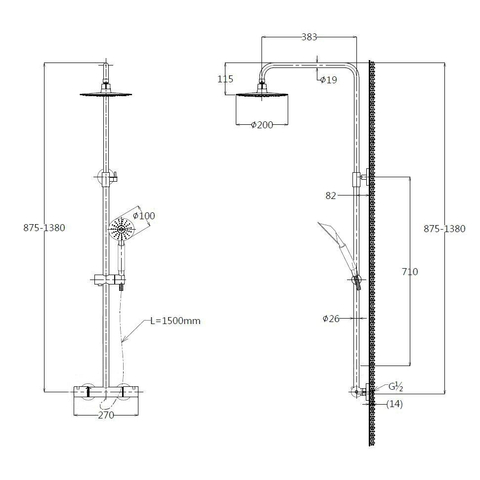 - RVS-304 Verstelbare glijstang op muurbuis 875-1380mm