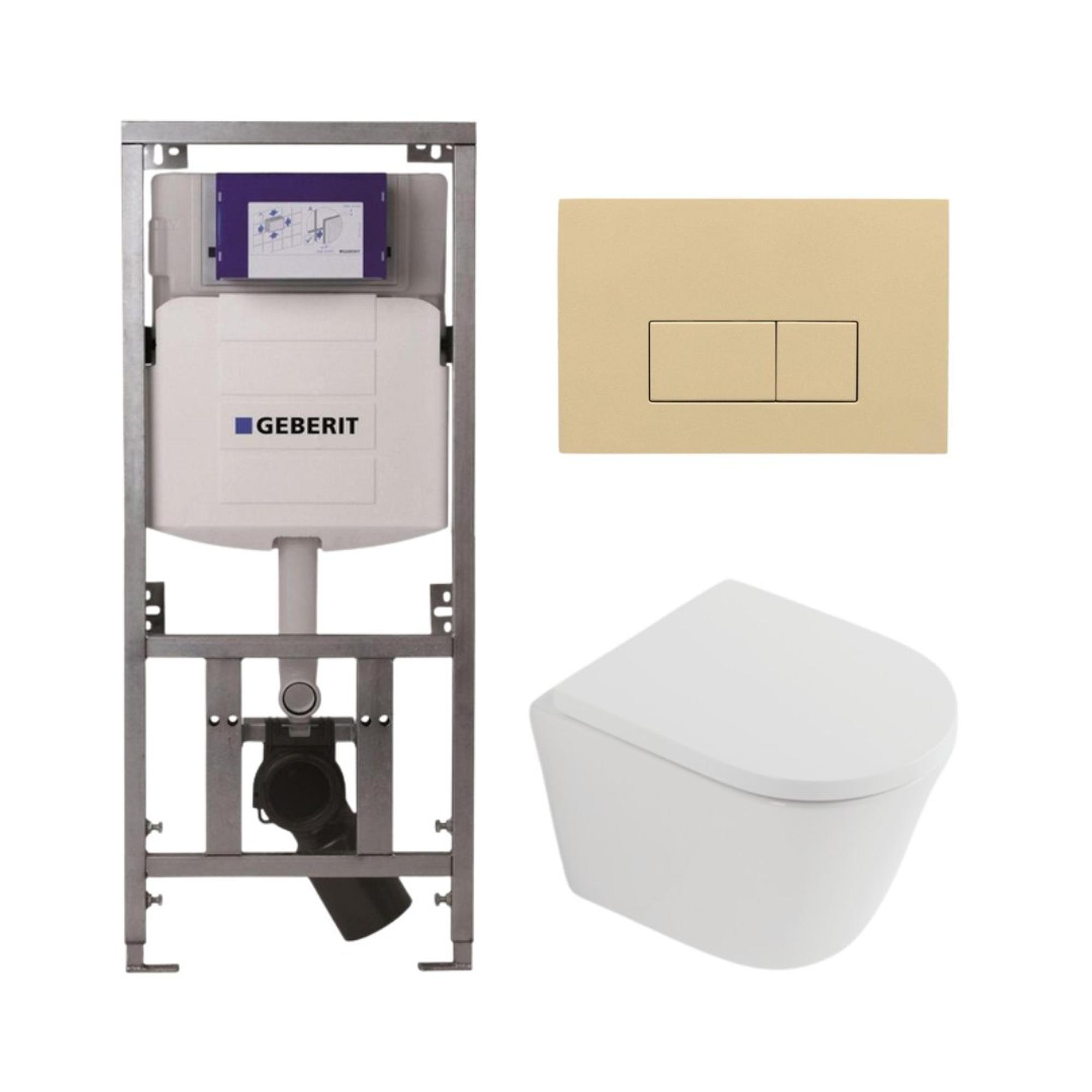 QeramiQ Dely Toiletset - 36.3x51.7cm - diepspoel - rimless - Geberit UP320 inbouwreservoir - softclose toiletzitting - beige bedieningsplaat - rechtehoekige knoppen - mat wit