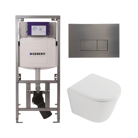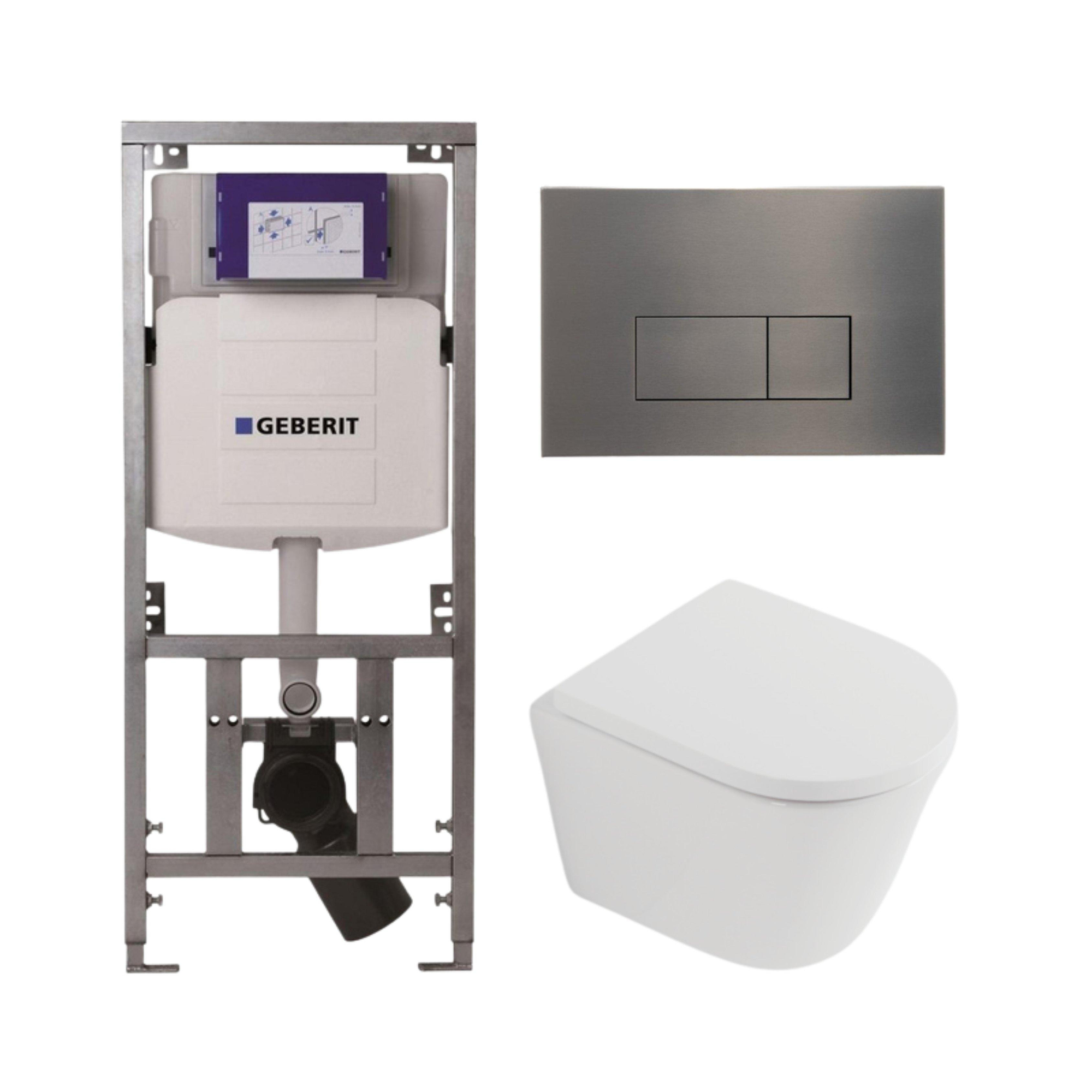 QeramiQ Dely Toiletset - 36.3x51.7cm - diepspoel - rimless - Geberit UP320 inbouwreservoir - softclose toiletzitting - gunmetal bedieningsplaat - rechtehoekige knoppen - mat wit