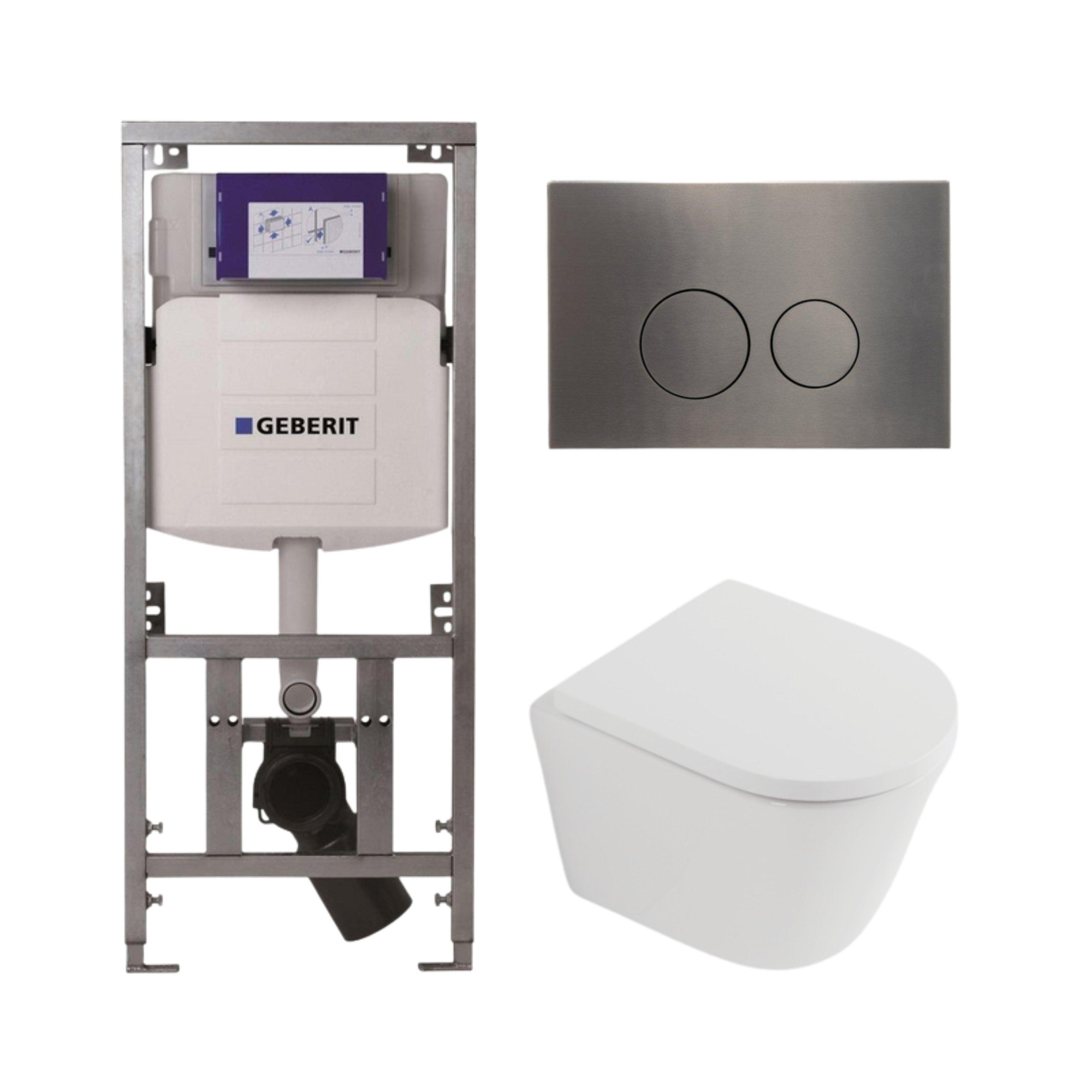 QeramiQ Dely Toiletset - 36.3x51.7cm - diepspoel - rimless - Geberit UP320 inbouwreservoir - softclose toiletzitting - gunmetal bedieningsplaat - ronde knoppen - mat wit