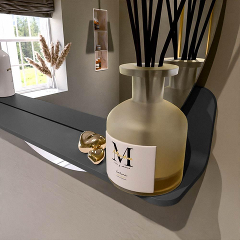 Het planchet, met zijn vloeiend afgeronde hoeken, biedt handige opbergruimte voor uw dagelijkse benodigdheden. De spiegel is subtiel verzonken in het planchet, wat zorgt voor een moderne en stijlvolle uitstraling.