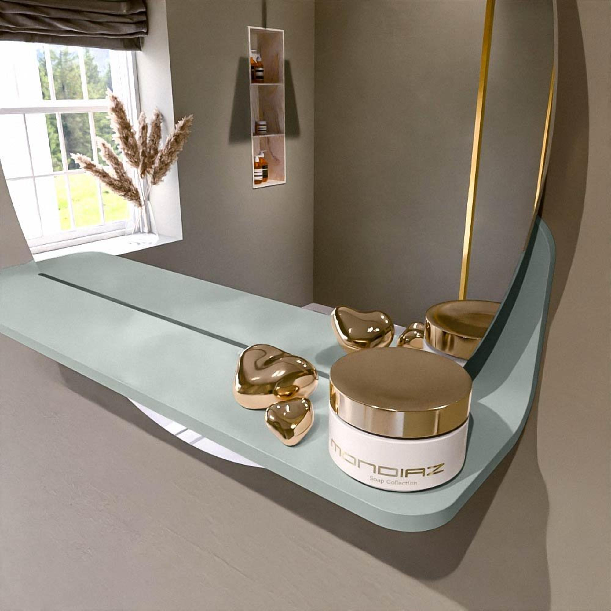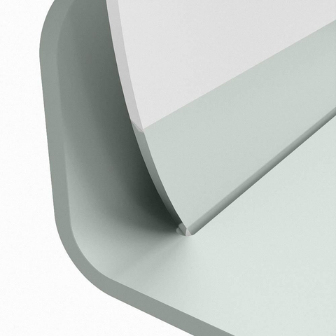 Het planchet, met zijn vloeiend afgeronde hoeken, biedt handige opbergruimte voor uw dagelijkse benodigdheden. De spiegel is subtiel verzonken in het planchet, wat zorgt voor een moderne en stijlvolle uitstraling.