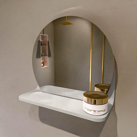 Beschikbaar in 17 effen kleuren die perfect passen bij elke inrichting. Solid Surface is krasbestendig, onderhoudsvriendelijk en garandeert een langdurige, luxueuze afwerking. Deze spiegel biedt de ideale combinatie van functionaliteit en design!