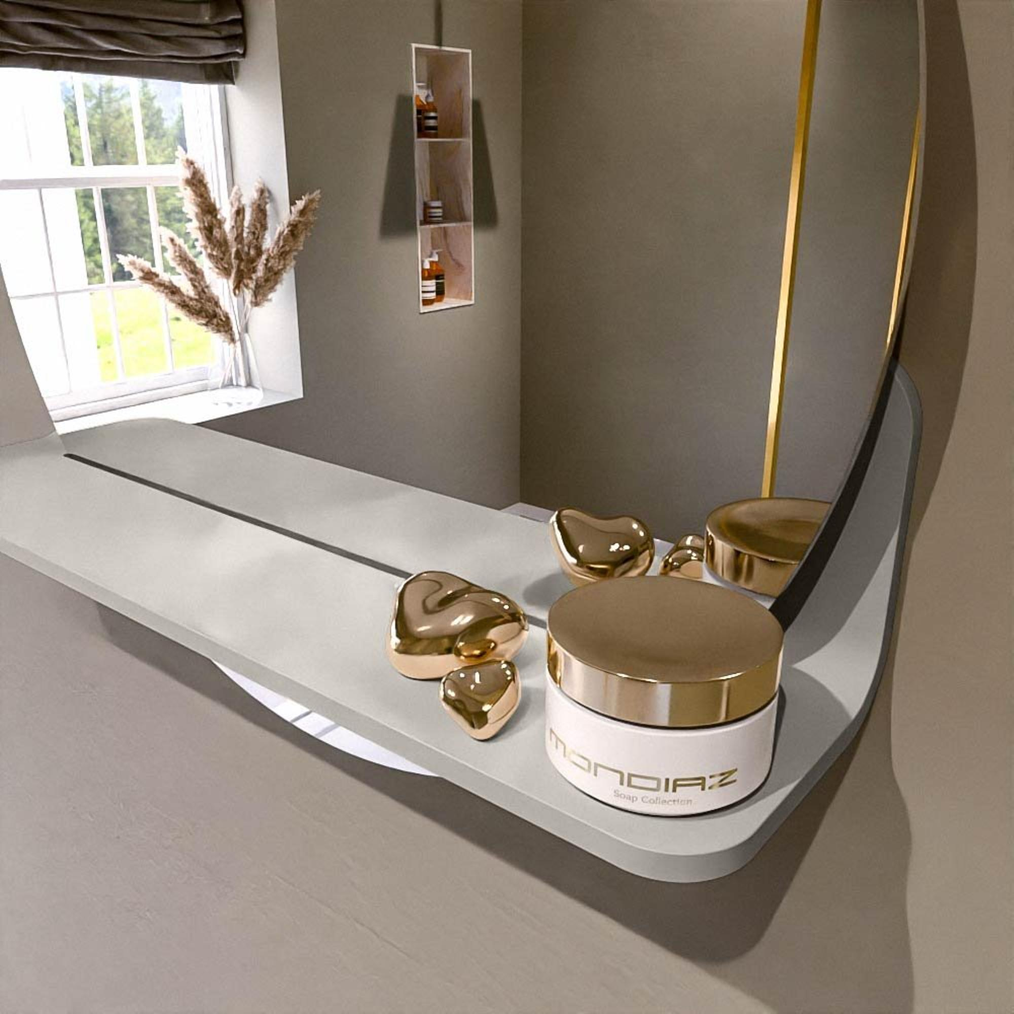 Het planchet, met zijn vloeiend afgeronde hoeken, biedt handige opbergruimte voor uw dagelijkse benodigdheden. De spiegel is subtiel verzonken in het planchet, wat zorgt voor een moderne en stijlvolle uitstraling.