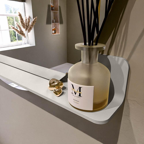 Beschikbaar in 17 effen kleuren die perfect passen bij elke inrichting. Solid Surface is krasbestendig, onderhoudsvriendelijk en garandeert een langdurige, luxueuze afwerking. Deze spiegel biedt de ideale combinatie van functionaliteit en design!
