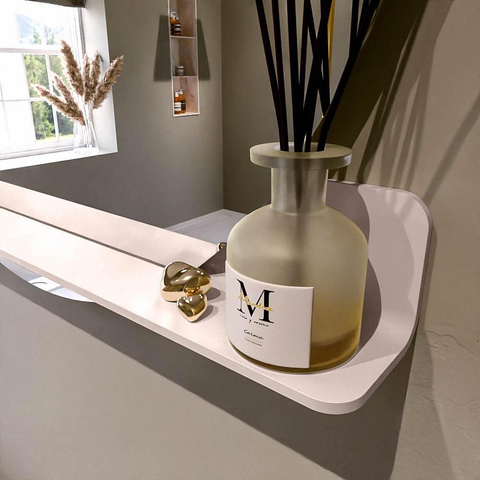 Beschikbaar in 17 effen kleuren die perfect passen bij elke inrichting. Solid Surface is krasbestendig, onderhoudsvriendelijk en garandeert een langdurige, luxueuze afwerking. Deze spiegel biedt de ideale combinatie van functionaliteit en design!