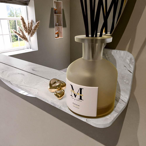 Het planchet, met zijn vloeiend afgeronde hoeken, biedt handige opbergruimte voor uw dagelijkse benodigdheden. De spiegel is subtiel verzonken in het planchet, wat zorgt voor een moderne en stijlvolle uitstraling.