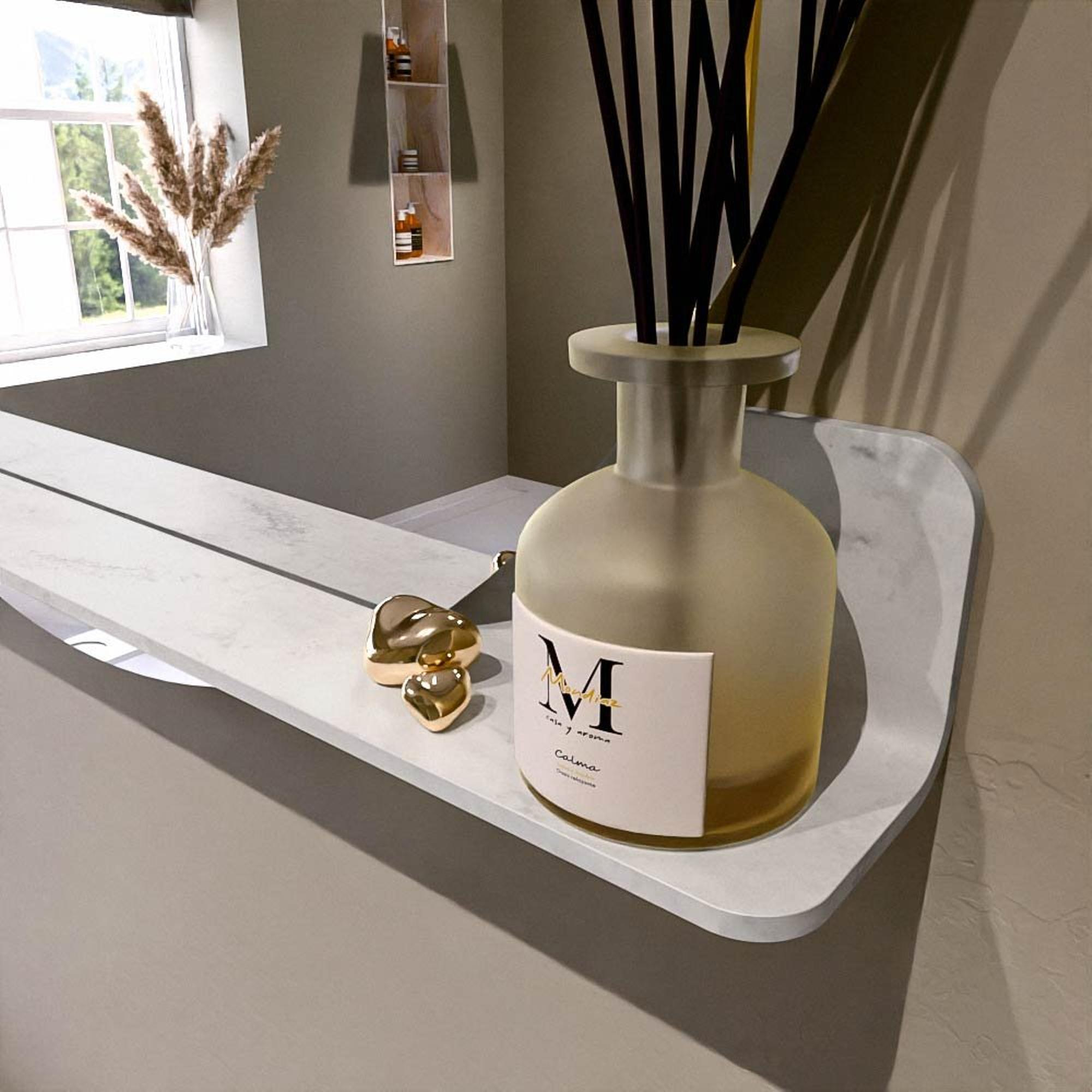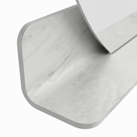 Het planchet, met zijn vloeiend afgeronde hoeken, biedt handige opbergruimte voor uw dagelijkse benodigdheden. De spiegel is subtiel verzonken in het planchet, wat zorgt voor een moderne en stijlvolle uitstraling.