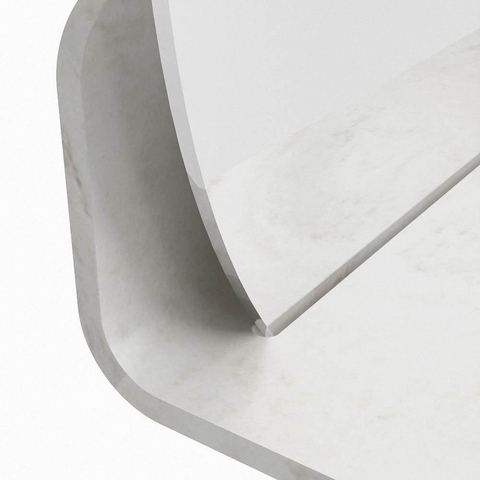Het planchet, met zijn vloeiend afgeronde hoeken, biedt handige opbergruimte voor uw dagelijkse benodigdheden. De spiegel is subtiel verzonken in het planchet, wat zorgt voor een moderne en stijlvolle uitstraling.