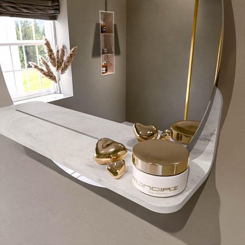 Beschikbaar in 5 CORIAN kleuren die perfect passen bij elke inrichting. Solid Surface is krasbestendig, onderhoudsvriendelijk en garandeert een langdurige, luxueuze afwerking. Deze spiegel biedt de ideale combinatie van functionaliteit en design!