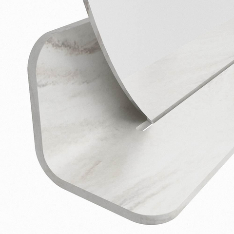 Het planchet, met zijn vloeiend afgeronde hoeken, biedt handige opbergruimte voor uw dagelijkse benodigdheden. De spiegel is subtiel verzonken in het planchet, wat zorgt voor een moderne en stijlvolle uitstraling.