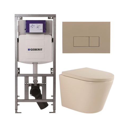 QeramiQ Dely Toiletset - 36.3x51.7cm - diepspoel - rimless - Geberit UP320 inbouwreservoir - softclose toiletzitting - taupe bedieningsplaat - rechtehoekige knoppen - mat beige