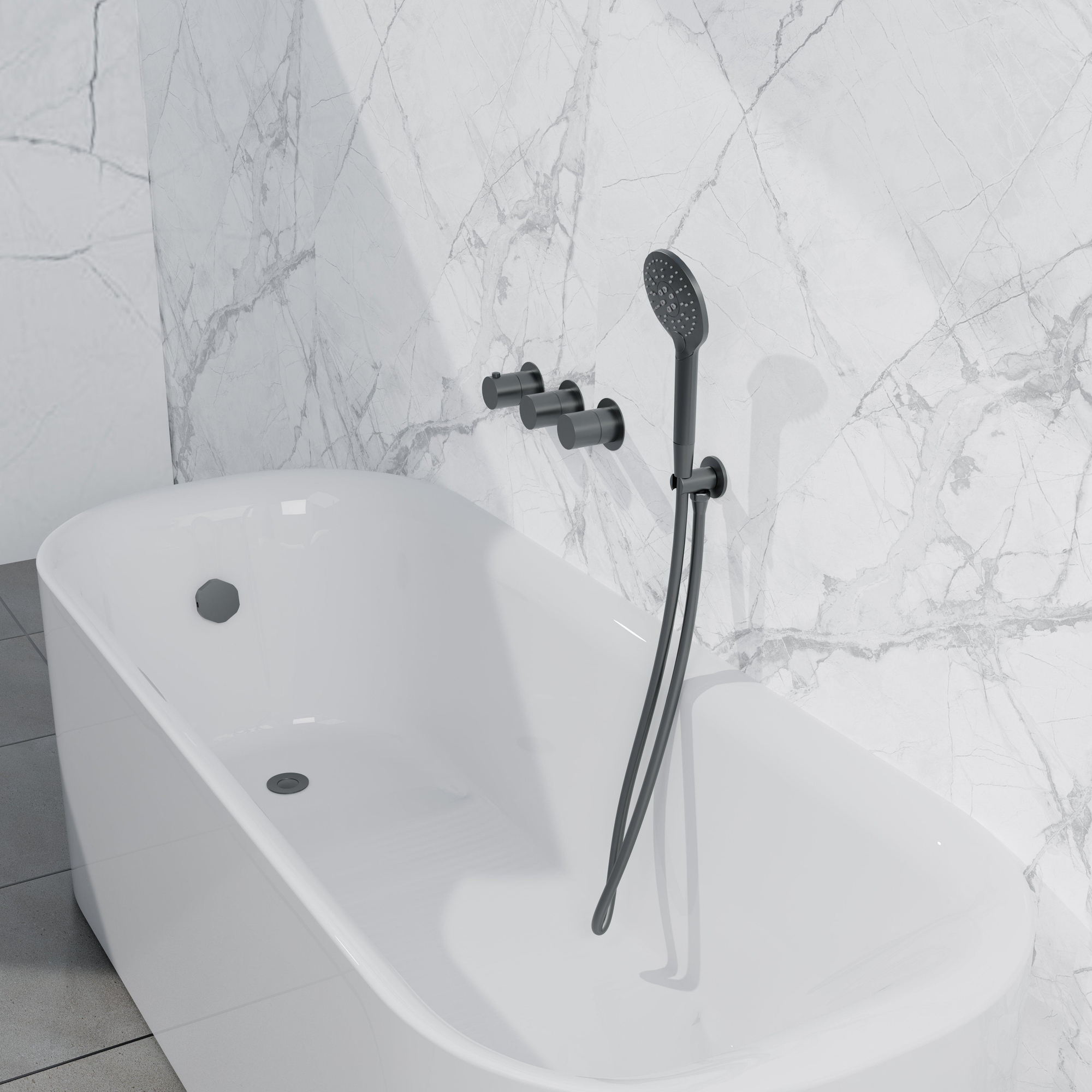 Geef je badkamer een stijlvolle upgrade met deze badcombinatie-set. De moderne uitstraling van de thermostaatkraan en de inbouwdeel past perfect bij eigentijdse badkamerontwerpen. De inbouw uitbreiding en wandaansluitbocht zorgen voor een nette en opgeruimde uitstraling. De ronde handdouche en gladde doucheslang combineren functionaliteit met elegantie, terwijl de geborsteld gunmetal PVD afwerking een trendy touch toevoegt aan je badkamer.