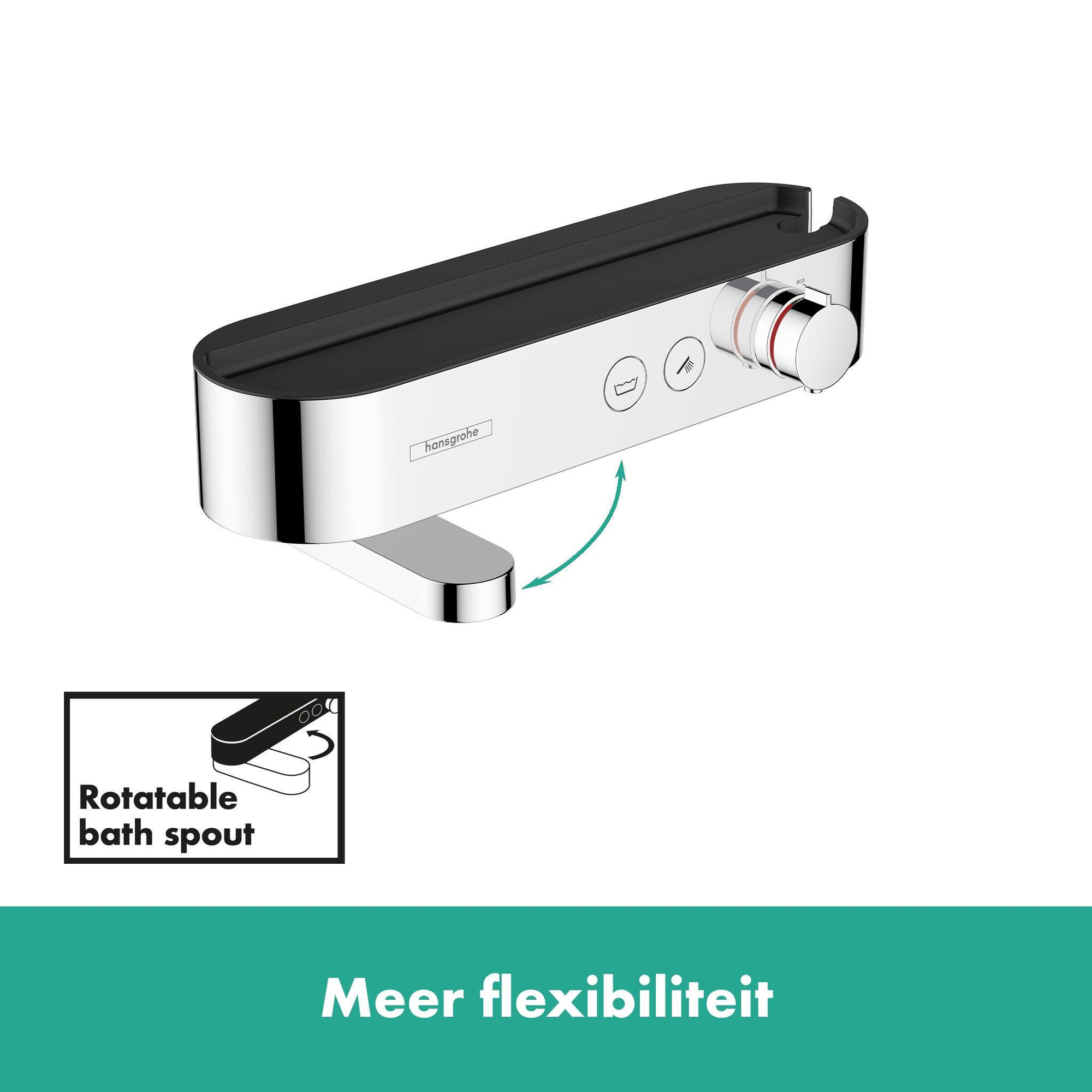 Met het moderne design en de slimme functionaliteiten biedt de ShowerTablet Select 400 badthermostaat (opbouwmontage) van hansgrohe je meer ruimte bij het bad - voor een nette badkamer waarin je je goed voelt. De 400 mm brede thermostaatkraan met afgeronde hoeken geeft je een ruim planchet voor je persoonlijke verzorgingsproducten. De platte baduitloop aan de onderzijde is makkelijk op te vouwen als deze niet in gebruik is. Dit maakt van de inbouw-thermostaatkraan een ruimtebesparend wonder. Een douchekop is altijd binnen handbereik dankzij de aan de zijkant geïntegreerde houder. Het