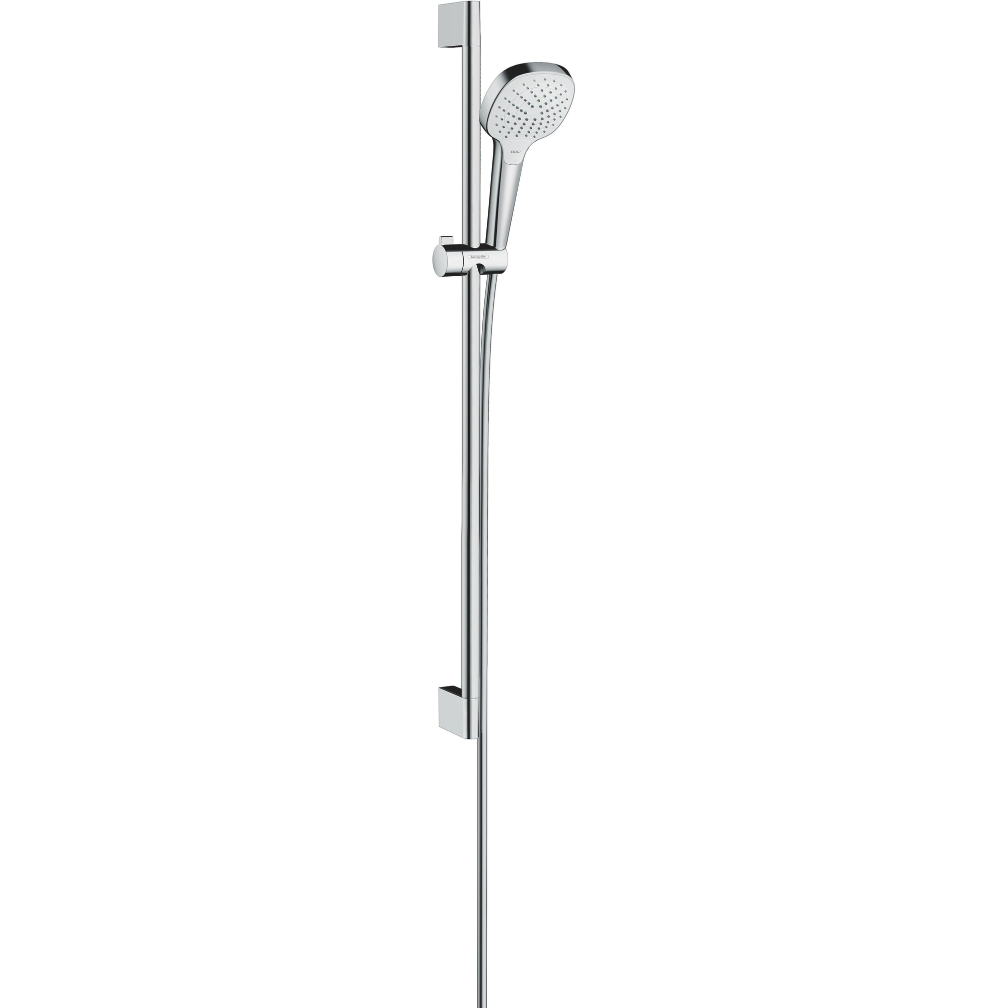 De comfortabeleCroma Select E Vario glijtangset van 90 centimeter is een complete set met douchehouder en douchekop. Je geniet tijdens het douchen van weldadige regenstralen waardoor je volledig tot rust komt. Deze set heeft een klassieke uitstraling en past daardoor bij vrijwel elke badkamer of doucheruimte. Dankzij de XXL douchekop is je hele lichaam tijdens het douchen omhuld met een ware waterdeken. Het reinigen van de douchekop gaat snel en gemakkelijk met het QuickClean anti-kalksysteem.Deze doucheset heeft een douchekop met een rechthoekige vorm. Je wisselt snel tussen de verschillende straalsoorten met de handige Select-knop waarbij je kunt kiezen uit een Rain straal, een Intense Rain straal of een Turbo Rain straal. De handdouche is geheel traploos te verstellen. Dankzij het 90 instelbare schuifstuk kun je de douchekop naar links, rechts, omhoog en omlaag draaien.
