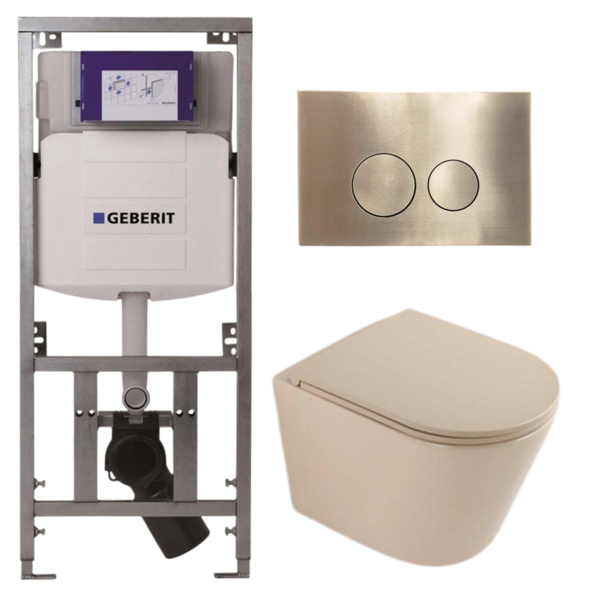 QeramiQ Dely Toiletset - 36.3x51.7cm - diepspoel - rimless - Geberit UP320 inbouwreservoir - softclose toiletzitting - geborsteld messing bedieningsplaat - ronde knoppen - mat beige