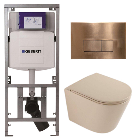 QeramiQ Dely Toiletset - 36.3x51.7cm - diepspoel - rimless - Geberit UP320 inbouwreservoir - softclose toiletzitting - koperen bedieningsplaat - rechtehoekige knoppen - mat beige