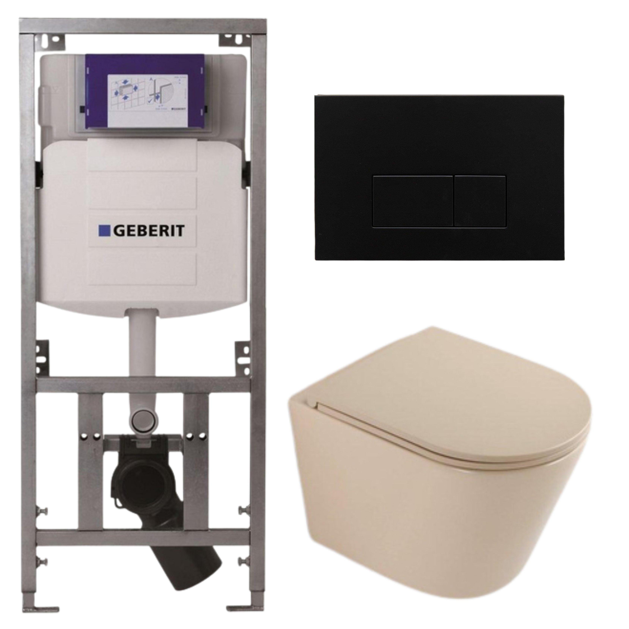 QeramiQ Dely Toiletset - 36.3x51.7cm - diepspoel - rimless - Geberit UP320 inbouwreservoir - softclose toilet zitting - metaal mat zwart bedieningsplaat - rechthoekige knoppen - mat beige