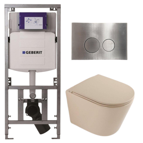 QeramiQ Dely Toiletset - 36.3x51.7cm - diepspoel - rimless - Geberit UP320 inbouwreservoir - softclose toilet zitting - steel bedieningsplaat - ronde knoppen - mat beige