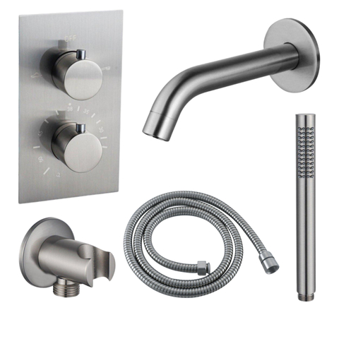 Fortifura Calvi Badkraan set - uitloop - 22cm inkortbaar - slang metaal - staafhanddouche - inbouwdeel - wandhouder - geborsteld RVS