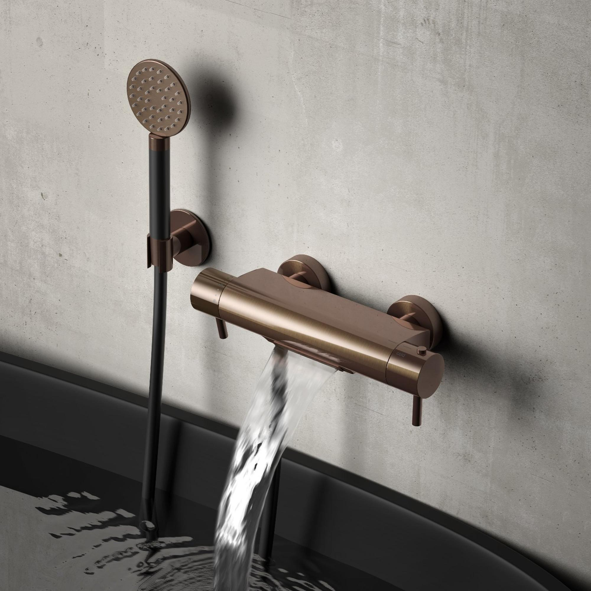 De koperen badkraan heeft een thermostaat kraan. Het fijne van een thermostaatkraan, is dat het door u ingestelde temperatuur van het water exact gelijk blijft. Via thermostatische kleppen wordt het koude en hete water zo gemengd, dat het water een constante temperatuur heeft. Wanneer de watertoevoer wijzigt, reageert de thermostaat direct, waardoor de temperatuur van het water gelijk blijft.