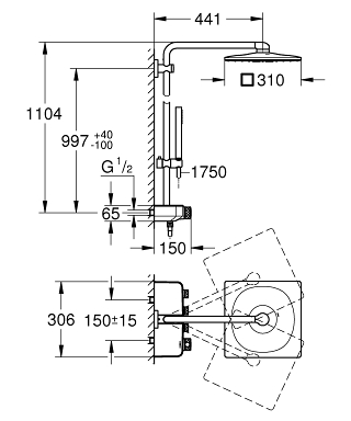 bestaat uit:horizontaal 450 mm douchearm