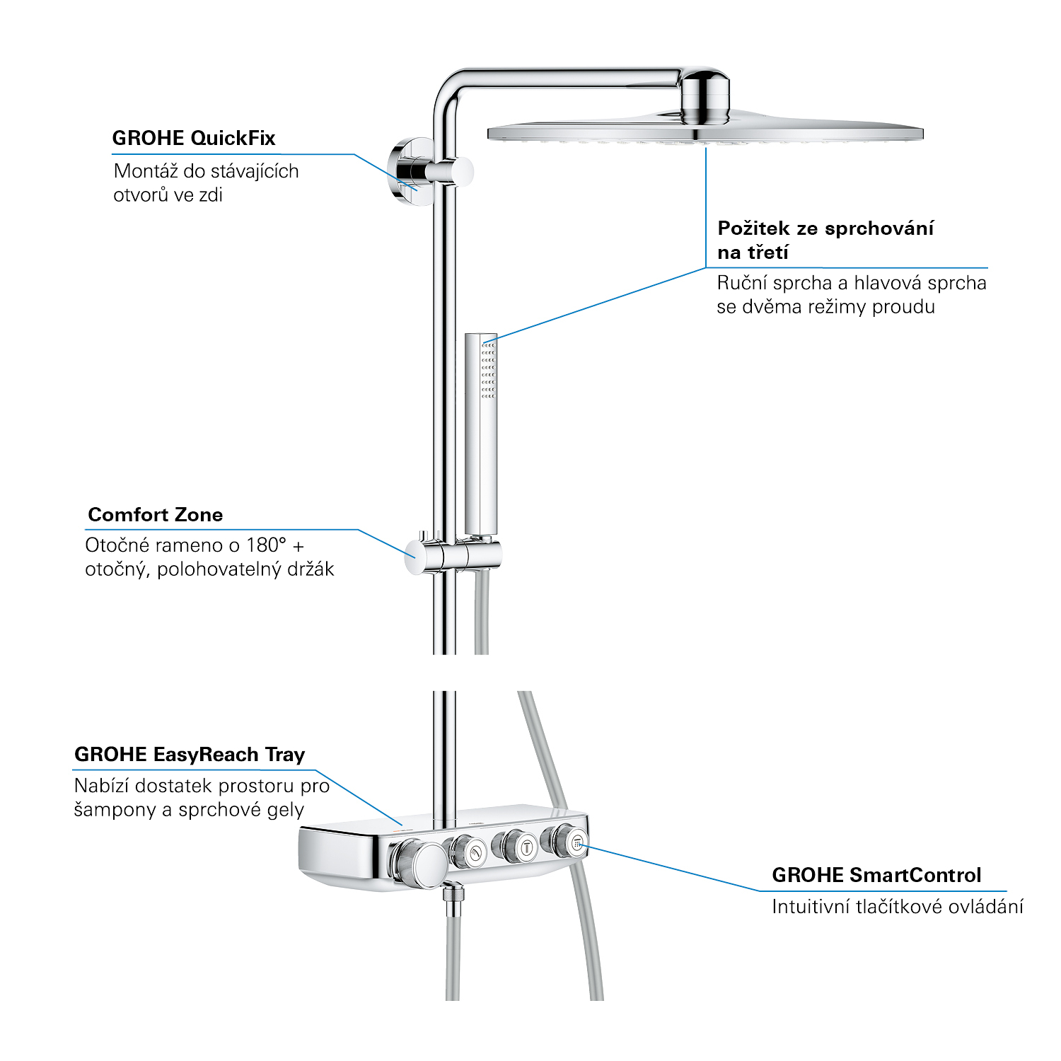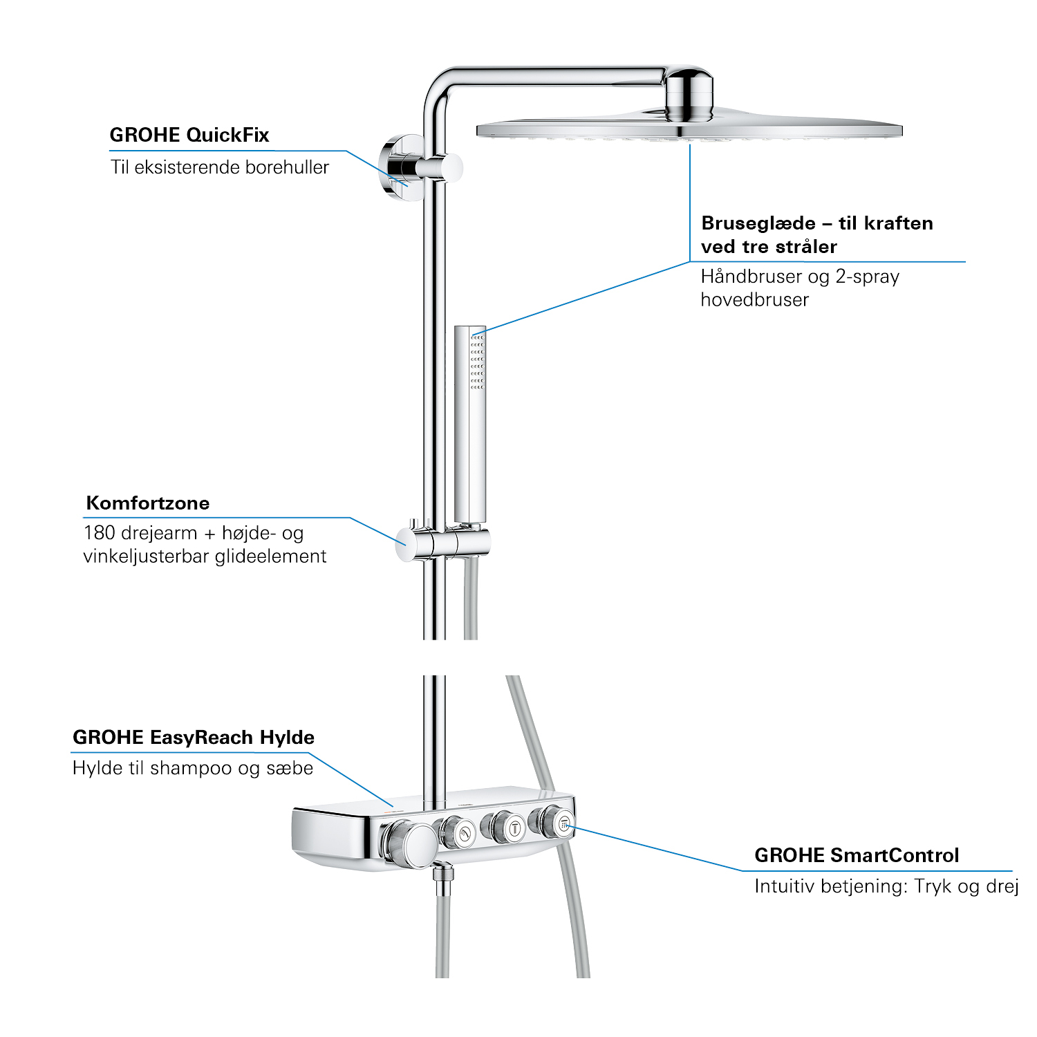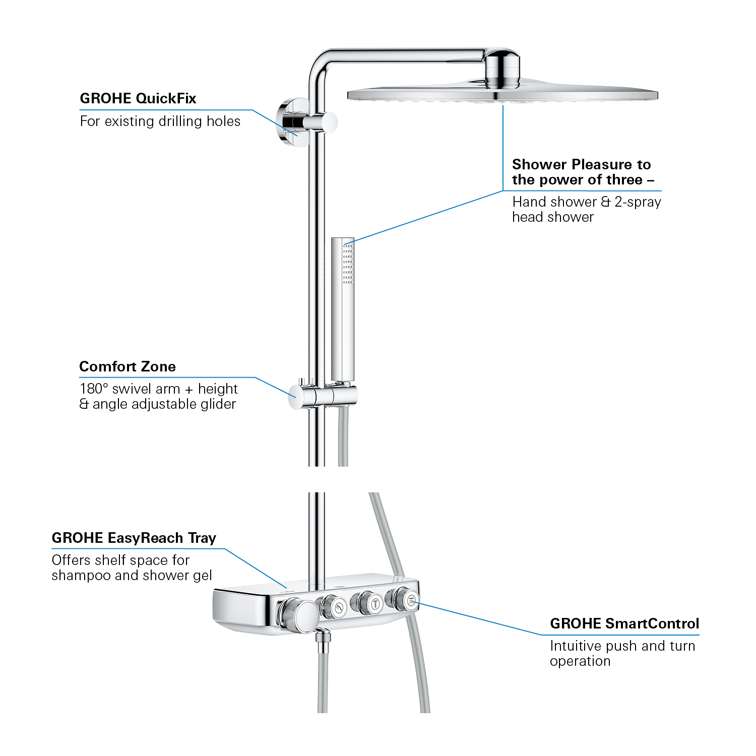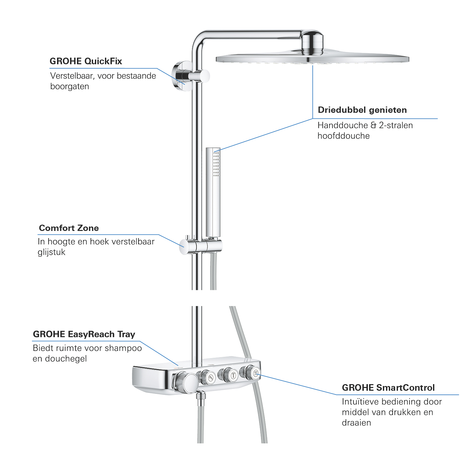 GROHE SmartControl: selecteer de straalsoort, stel het watervolume in en sla je instellingen op met de eenvoudige knoppen GROHE TurboStat® - vrijwel meteen de juiste watertemperatuur die constant blijft GROHE CoolTouch®: om verbranding van de huid te voorkomen GROHE SafeStop (Plus) – biedt dubbele bescherming tegen verbranding door heet water GROHE EcoJoy®: bespaar op je waterverbruik én op je maandelijkse energiekosten GROHE Long-Life Finish – duurzaam en optimaal schoonmaakgemak GROHE FastFixation®: installeer je douche in een handomdraai Praktische GROHE EasyReach™ tray voor shampoo en douchegel GROHE DreamSpray®: zorgt voor een volle douchestraal door een gelijkmatige waterverdeling over alle sproeigaatjes GROHE PureRain Spray: pure ontspanning voor je huid GROHE ActiveRain Spray – perfect om je haren uit te spoelen en je hoofd te masseren Normal Spray: een krachtige en verfrissende douchestraal Anti-kalk SpeedClean houdt je douche eenvoudig kalkvrij GROHE Inner WaterGuide: voorkomt oververhitting van de handdouche en beschermt de chroomlaag TwistFree – een flexibele doucheslang die niet in de knoop raakt GROHE EasyLogic®: eenvoudige en soepele bediening