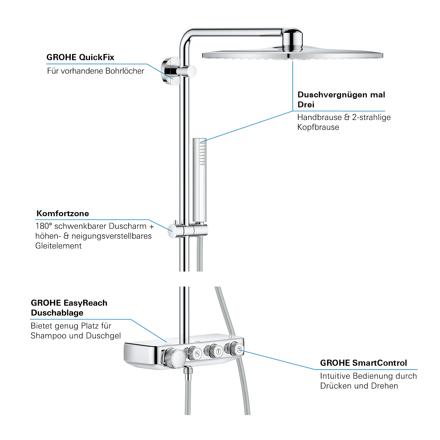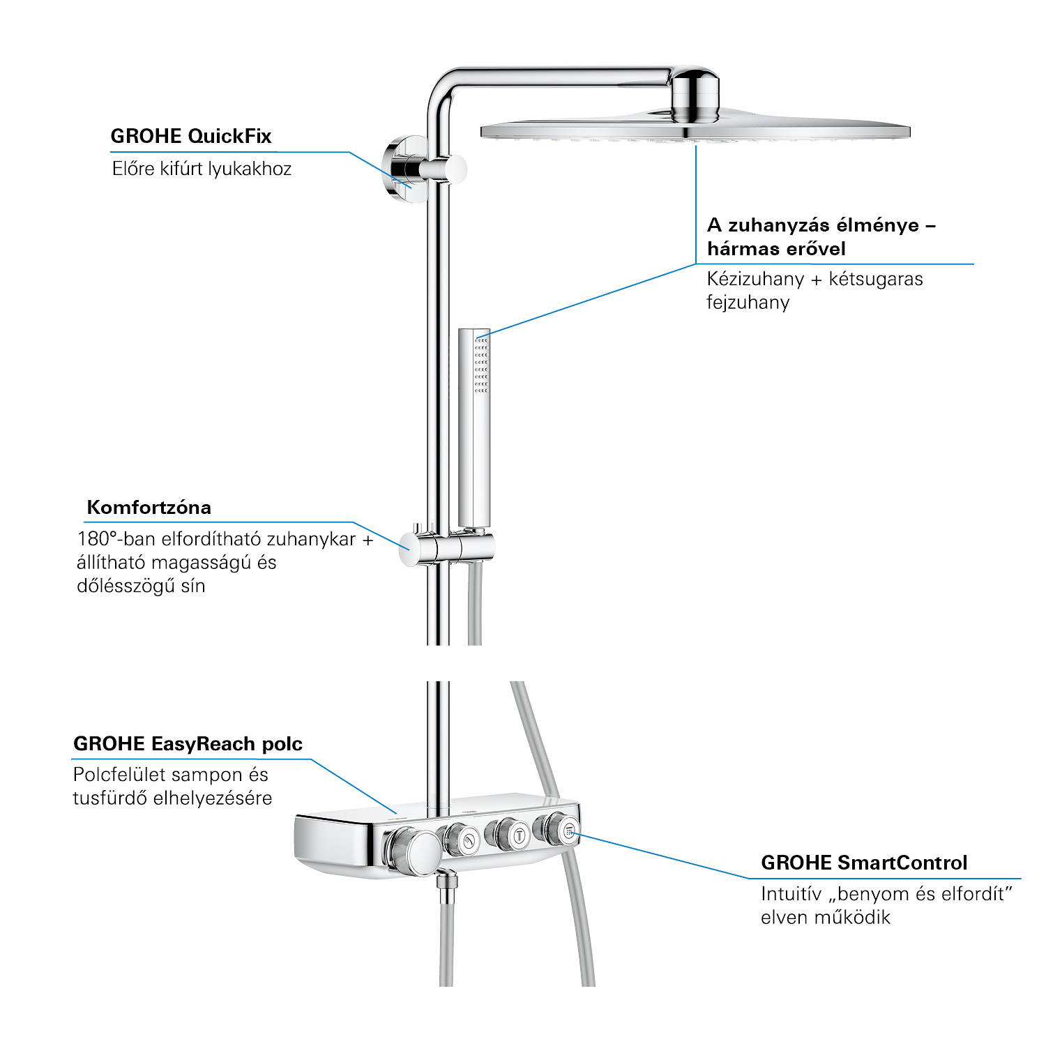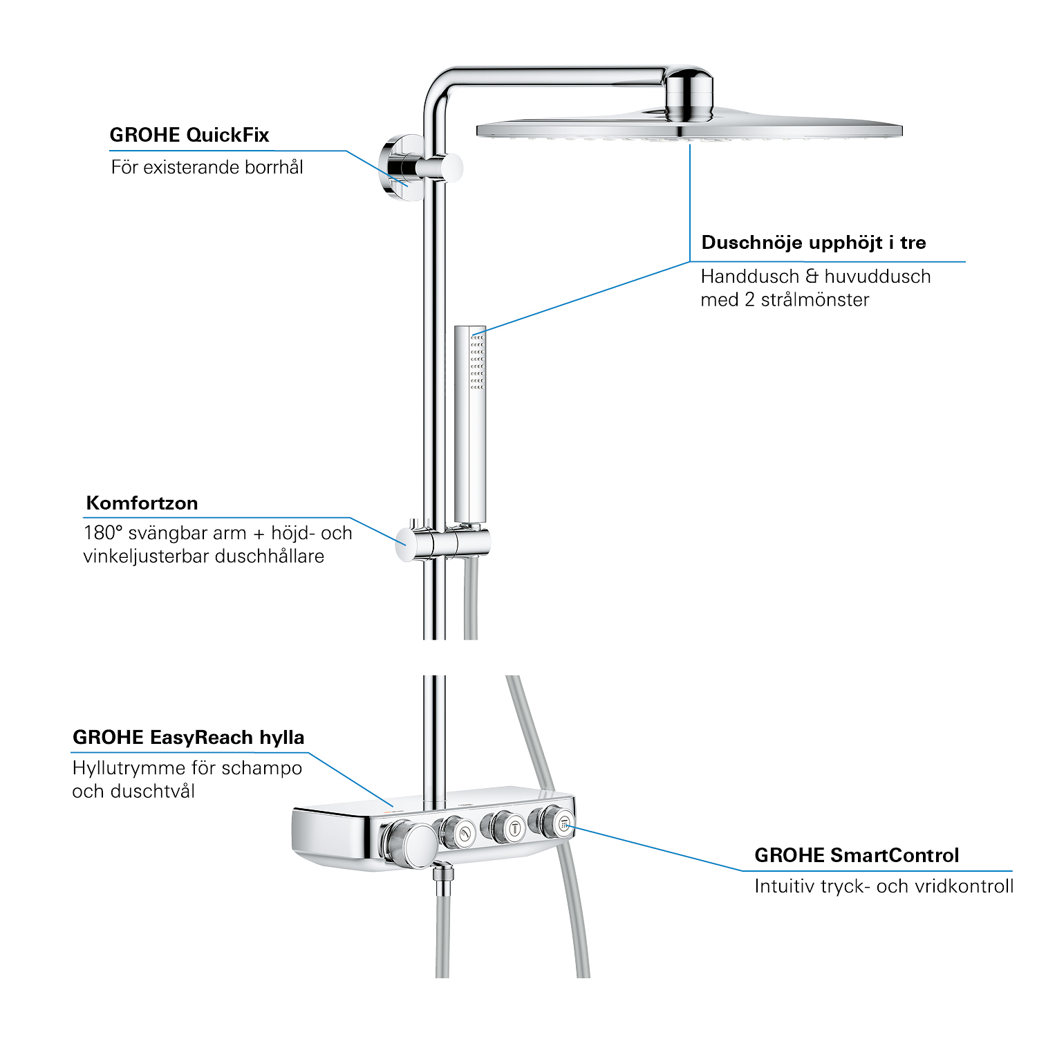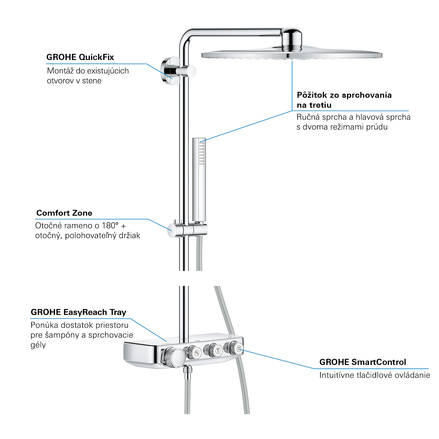 GROHE SmartControl: selecteer de straalsoort, stel het watervolume in en sla je instellingen op met de eenvoudige knoppen GROHE TurboStat® - vrijwel meteen de juiste watertemperatuur die constant blijft GROHE CoolTouch®: om verbranding van de huid te voorkomen GROHE SafeStop (Plus) – biedt dubbele bescherming tegen verbranding door heet water GROHE EcoJoy®: bespaar op je waterverbruik én op je maandelijkse energiekosten GROHE Long-Life Finish – duurzaam en optimaal schoonmaakgemak GROHE FastFixation®: installeer je douche in een handomdraai Praktische GROHE EasyReach™ tray voor shampoo en douchegel GROHE DreamSpray®: zorgt voor een volle douchestraal door een gelijkmatige waterverdeling over alle sproeigaatjes GROHE PureRain Spray: pure ontspanning voor je huid GROHE ActiveRain Spray – perfect om je haren uit te spoelen en je hoofd te masseren Normal Spray: een krachtige en verfrissende douchestraal Anti-kalk SpeedClean houdt je douche eenvoudig kalkvrij GROHE Inner WaterGuide: voorkomt oververhitting van de handdouche en beschermt de chroomlaag TwistFree – een flexibele doucheslang die niet in de knoop raakt GROHE EasyLogic®: eenvoudige en soepele bediening