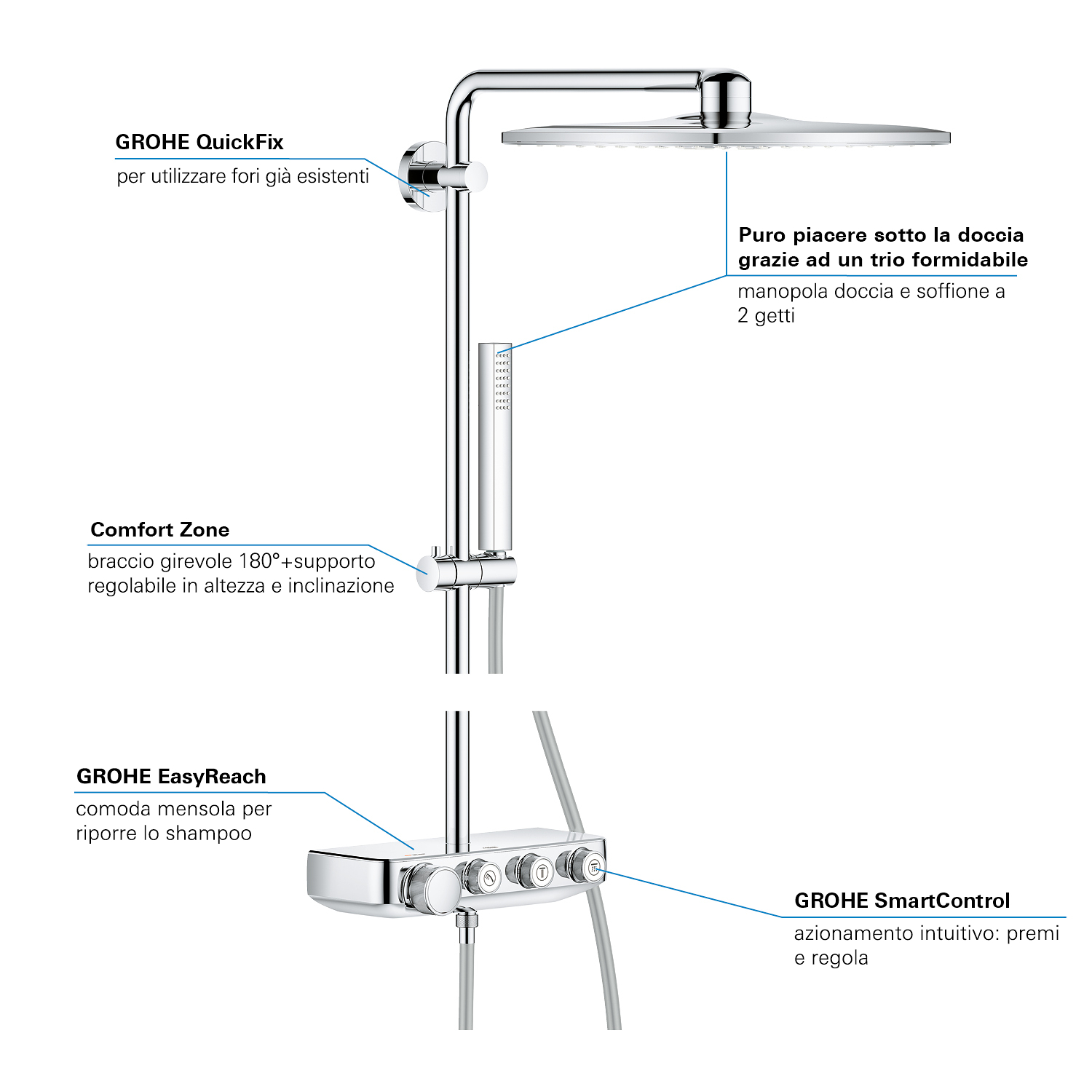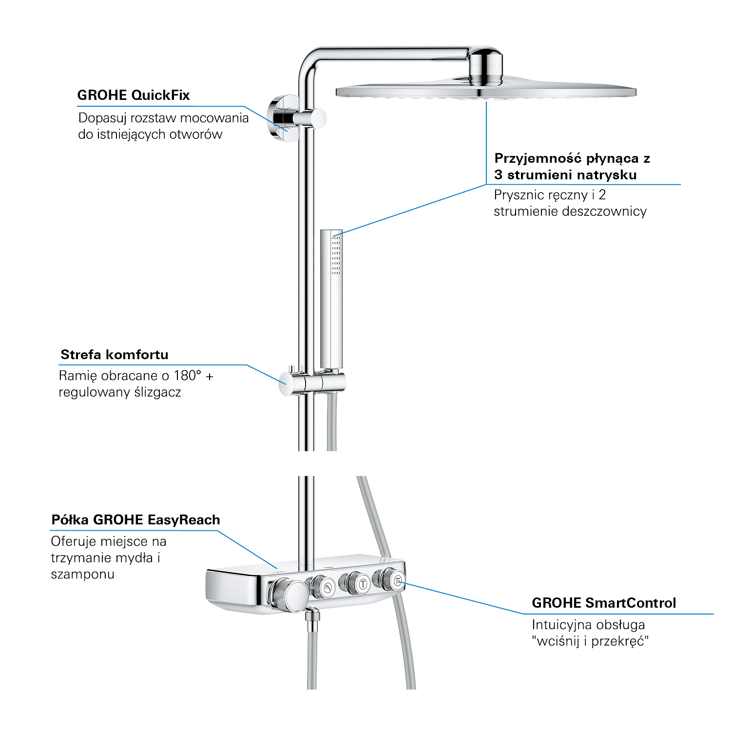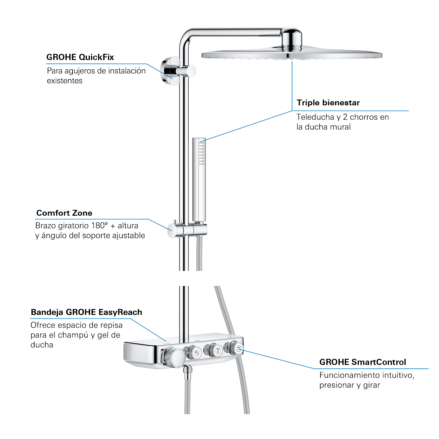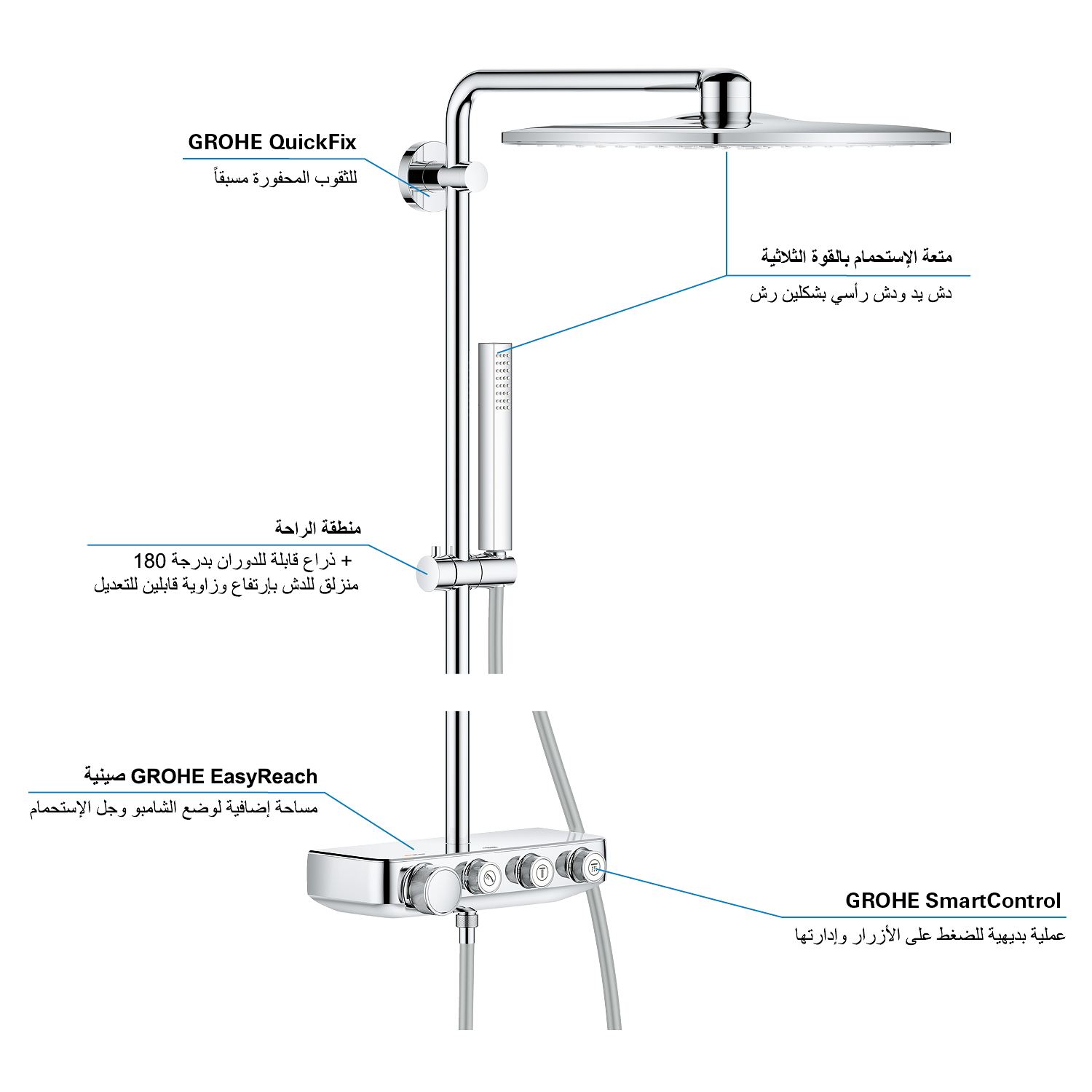 GROHE SmartControl: selecteer de straalsoort, stel het watervolume in en sla je instellingen op met de eenvoudige knoppen GROHE TurboStat® - vrijwel meteen de juiste watertemperatuur die constant blijft GROHE CoolTouch®: om verbranding van de huid te voorkomen GROHE SafeStop (Plus) – biedt dubbele bescherming tegen verbranding door heet water GROHE EcoJoy®: bespaar op je waterverbruik én op je maandelijkse energiekosten GROHE Long-Life Finish – duurzaam en optimaal schoonmaakgemak GROHE FastFixation®: installeer je douche in een handomdraai Praktische GROHE EasyReach™ tray voor shampoo en douchegel GROHE DreamSpray®: zorgt voor een volle douchestraal door een gelijkmatige waterverdeling over alle sproeigaatjes GROHE PureRain Spray: pure ontspanning voor je huid GROHE ActiveRain Spray – perfect om je haren uit te spoelen en je hoofd te masseren Normal Spray: een krachtige en verfrissende douchestraal Anti-kalk SpeedClean houdt je douche eenvoudig kalkvrij GROHE Inner WaterGuide: voorkomt oververhitting van de handdouche en beschermt de chroomlaag TwistFree – een flexibele doucheslang die niet in de knoop raakt GROHE EasyLogic®: eenvoudige en soepele bediening