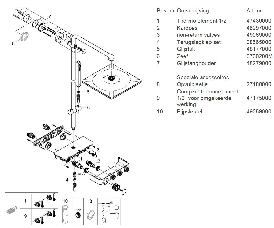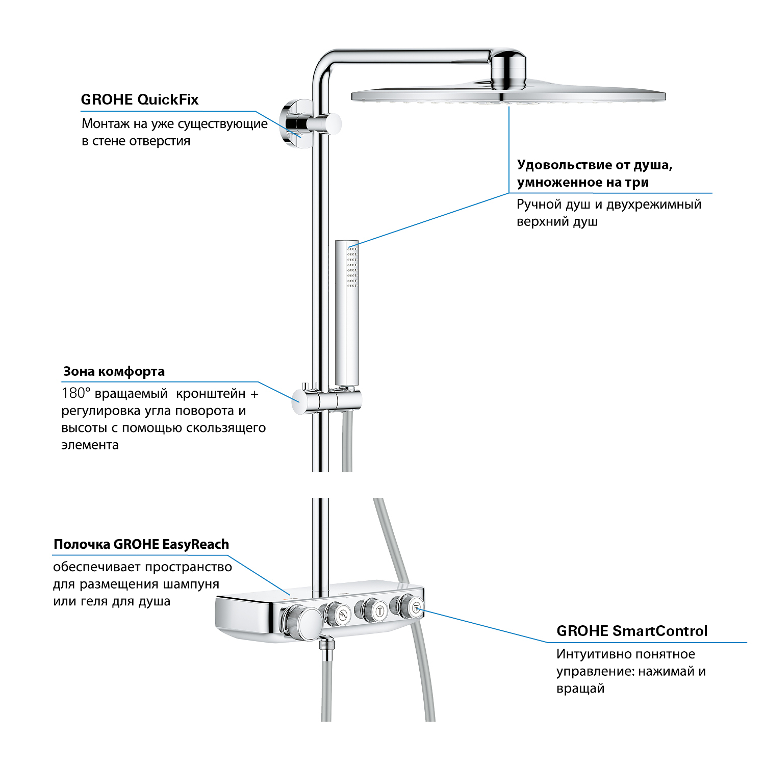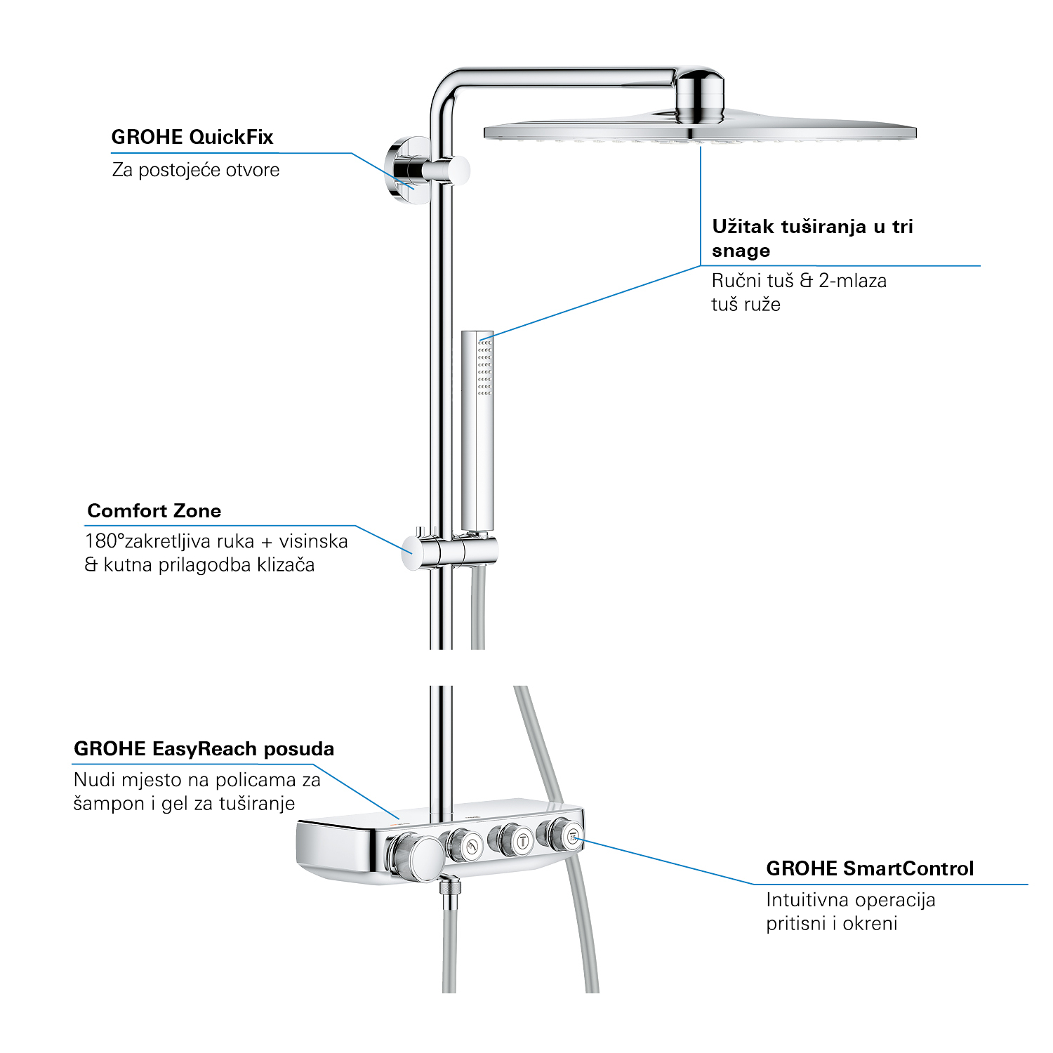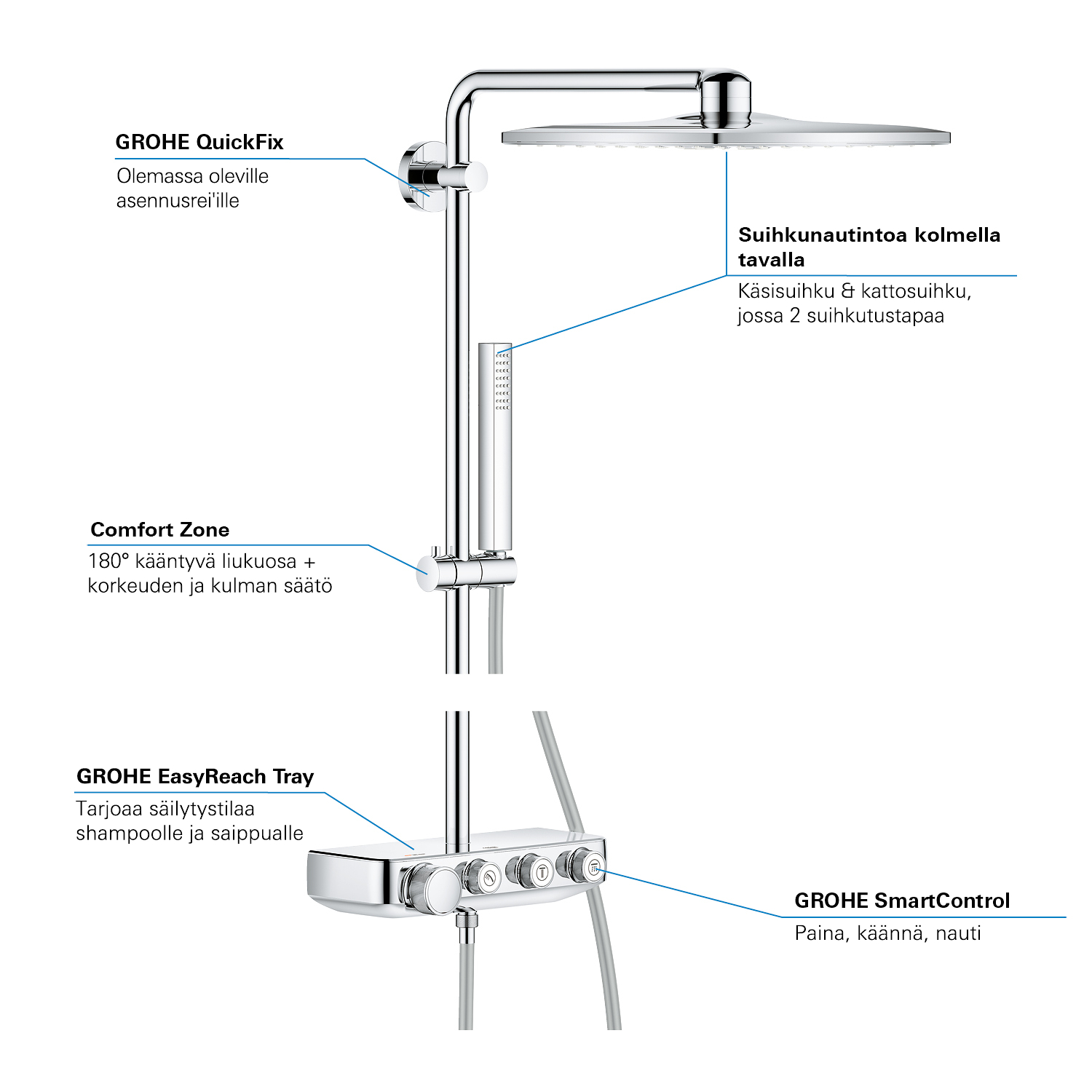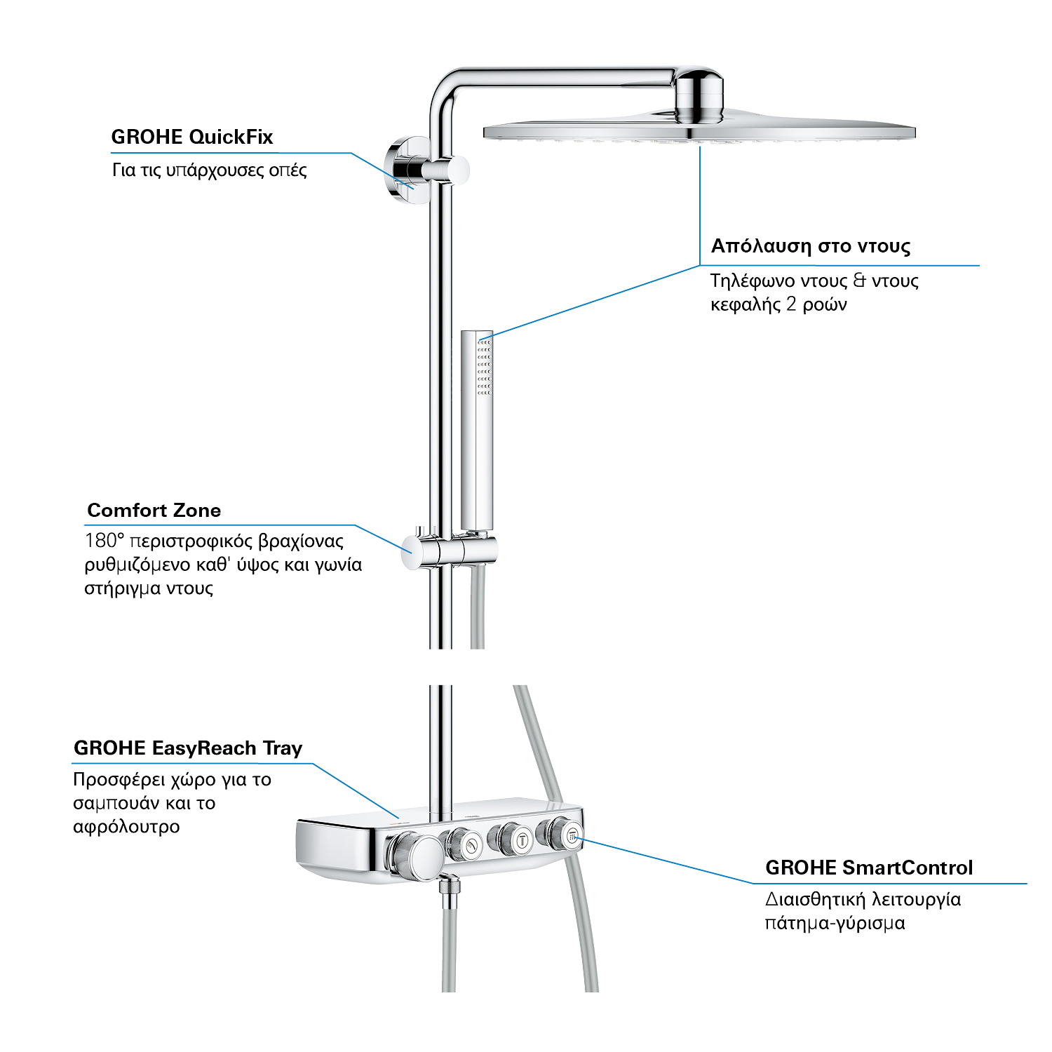 GROHE SmartControl: selecteer de straalsoort, stel het watervolume in en sla je instellingen op met de eenvoudige knoppen GROHE TurboStat® - vrijwel meteen de juiste watertemperatuur die constant blijft GROHE CoolTouch®: om verbranding van de huid te voorkomen GROHE SafeStop (Plus) – biedt dubbele bescherming tegen verbranding door heet water GROHE EcoJoy®: bespaar op je waterverbruik én op je maandelijkse energiekosten GROHE Long-Life Finish – duurzaam en optimaal schoonmaakgemak GROHE FastFixation®: installeer je douche in een handomdraai Praktische GROHE EasyReach™ tray voor shampoo en douchegel GROHE DreamSpray®: zorgt voor een volle douchestraal door een gelijkmatige waterverdeling over alle sproeigaatjes GROHE PureRain Spray: pure ontspanning voor je huid GROHE ActiveRain Spray – perfect om je haren uit te spoelen en je hoofd te masseren Normal Spray: een krachtige en verfrissende douchestraal Anti-kalk SpeedClean houdt je douche eenvoudig kalkvrij GROHE Inner WaterGuide: voorkomt oververhitting van de handdouche en beschermt de chroomlaag TwistFree – een flexibele doucheslang die niet in de knoop raakt GROHE EasyLogic®: eenvoudige en soepele bediening