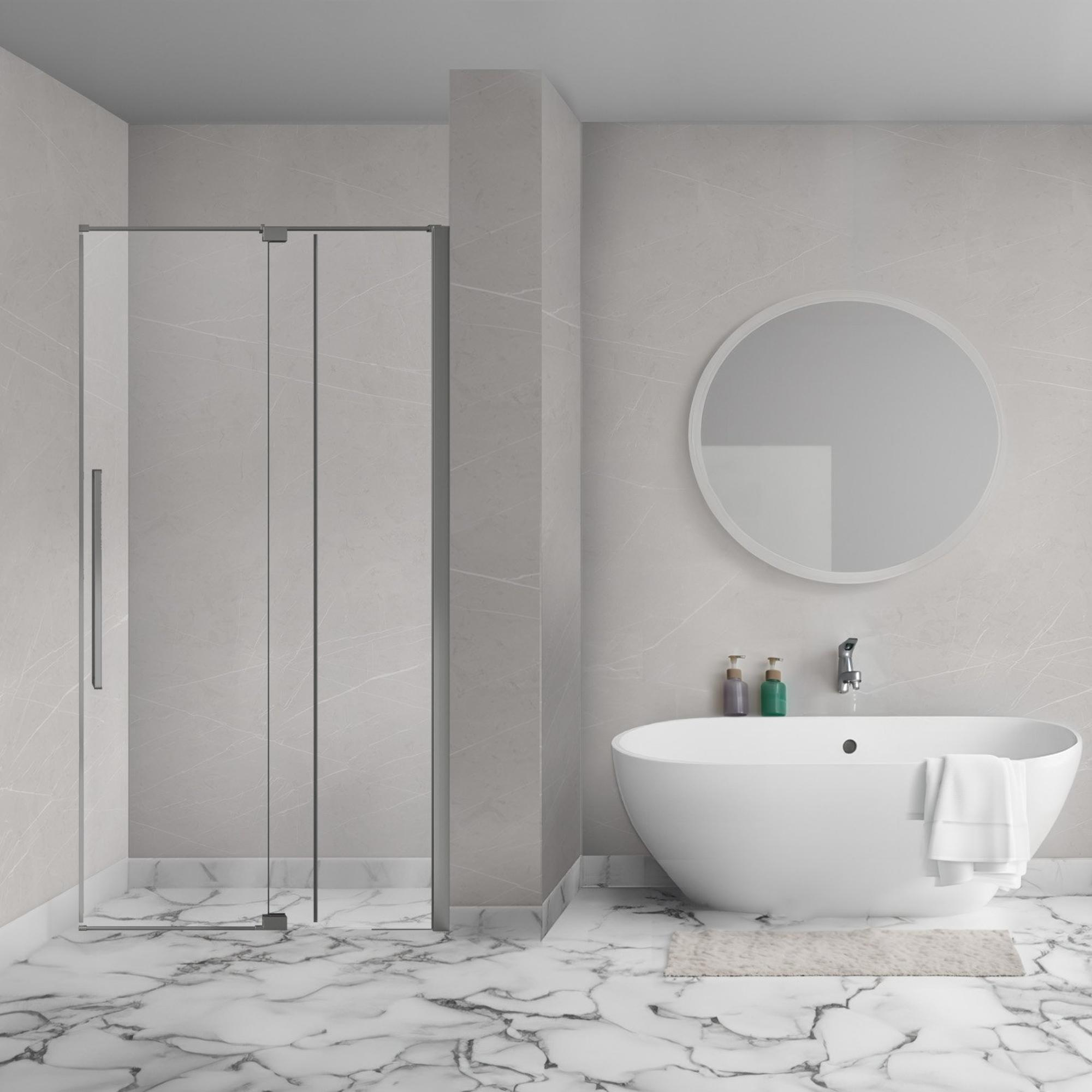De Taviano Linea nisdeur combineert functionaliteit met stijl op een unieke manier. Het gunmetal frame voegt een vleugje verfijning toe aan de badkamer en vormt een elegant contrast met de glazen panelen. De soepele schuifdeur zorgt voor gemakkelijke toegang en maakt optimaal gebruik van de beschikbare ruimte. Deze nisdeur is niet alleen een praktische toevoeging aan de badkamer, maar ook een stijlvolle blikvanger die de ruimte transformeert tot een luxe spa-ervaring.