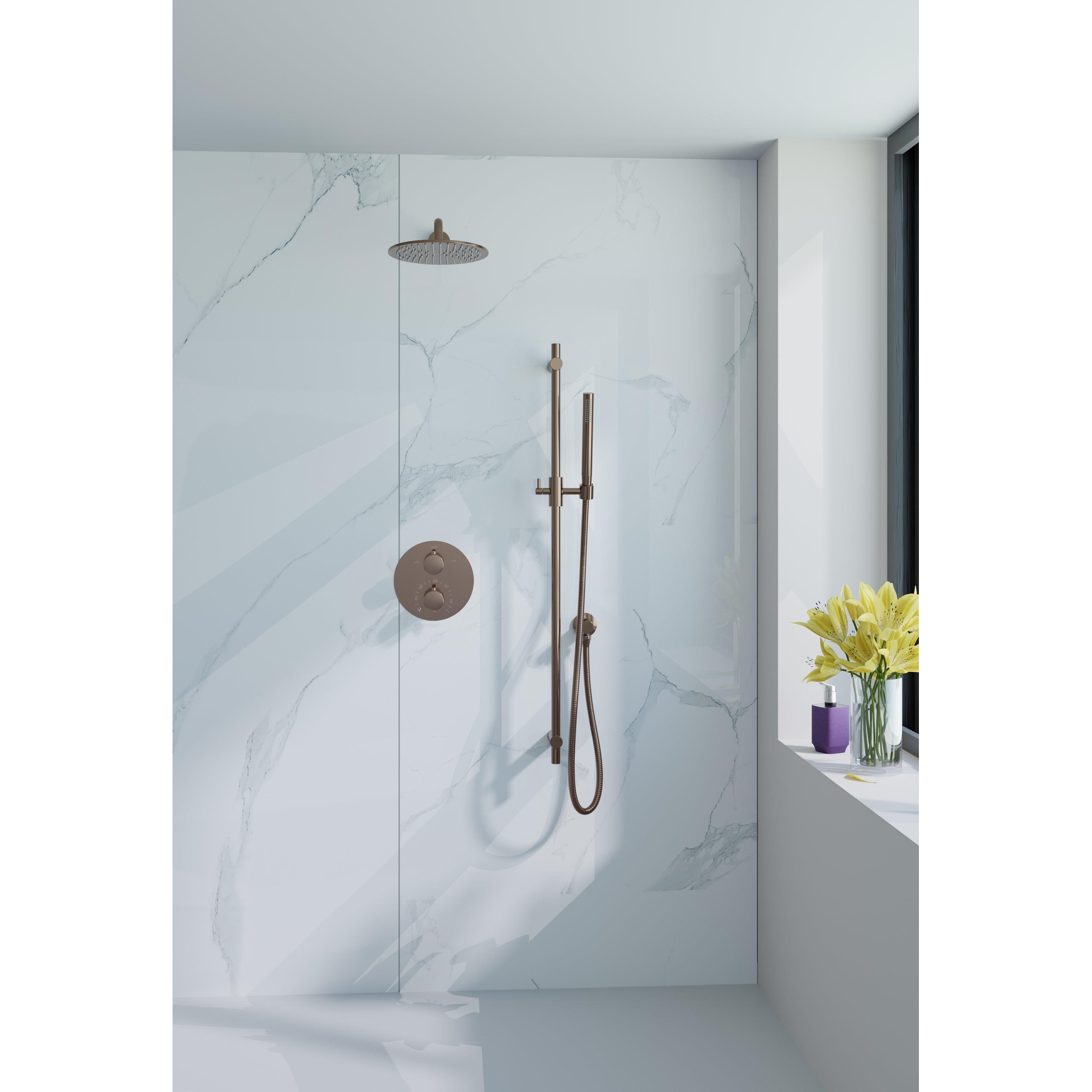 Fortifura Calvi Inbouw Regendoucheset - rond - thermostatisch - wandarm - glijstang - 25cm hoofddouche - staaf handdouche - gladde slang - Geborsteld koper PVD (Koper)