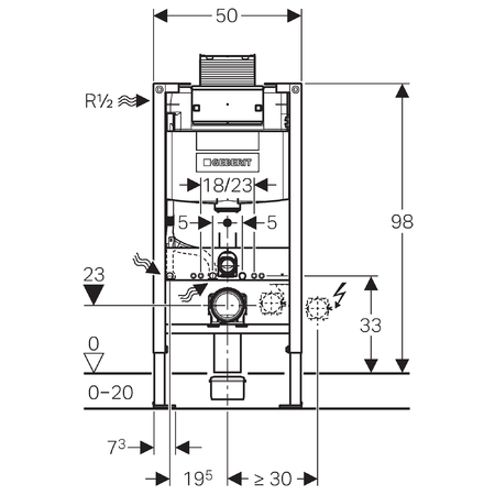 - Diepte vloerbevestigingsconsole passend aan de inbouw in U-profielen UW 50 en UW 75 en Geberit Duofix systeemprofielen