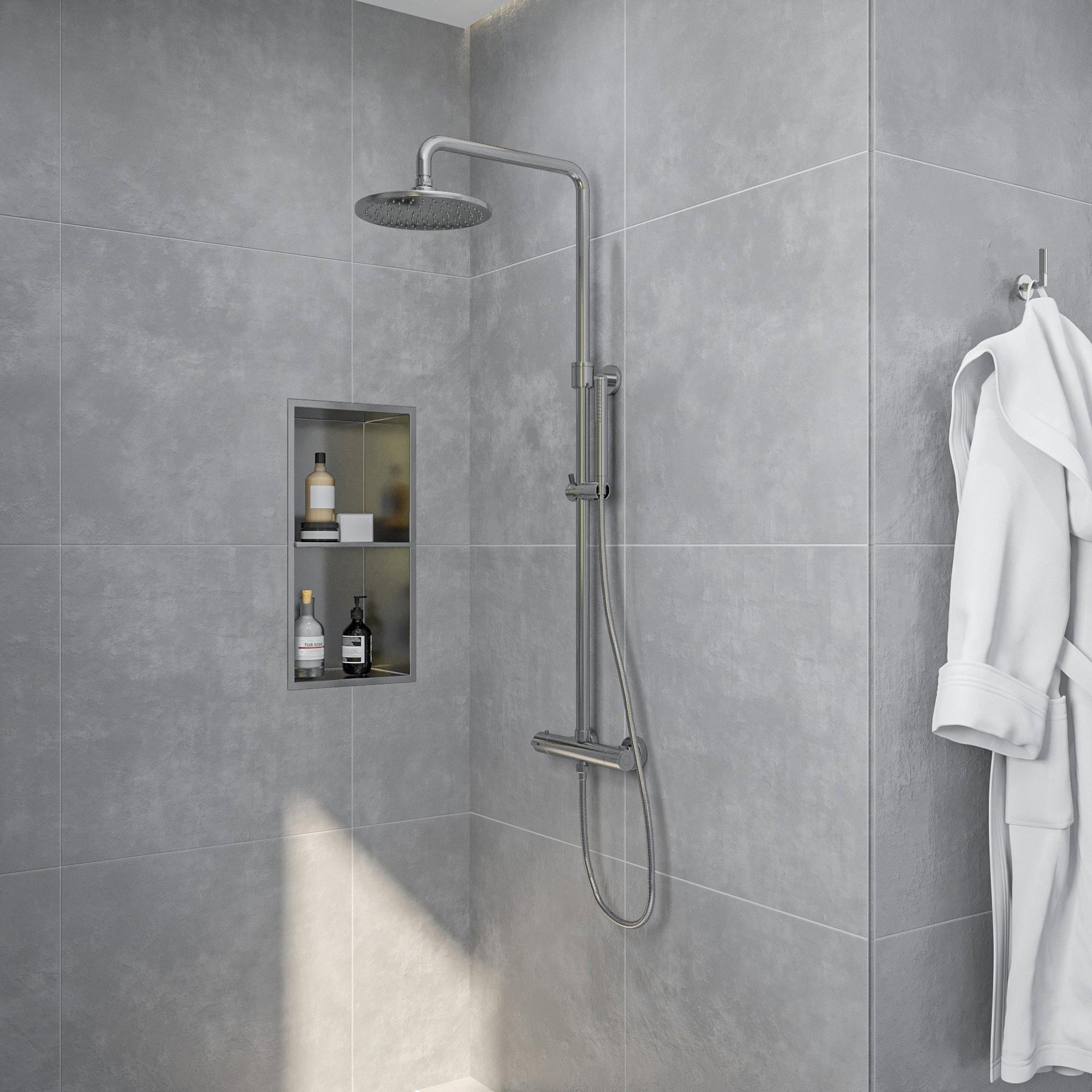Met de thermostatische regendouche van de Fortifura Calvi Thermostatische Regendoucheset geniet je van ultiem comfort. Stel eenvoudig de gewenste watertemperatuur in en laat je verwennen door de ontspannende regenstraal. De regendouche zorgt voor een luxe spa-ervaring in je eigen badkamer, waardoor elke douchebeurt een verwenmoment wordt. De combinatie van de ronde hoofddouche en de staafhanddouche biedt veelzijdigheid en gemak voor een gepersonaliseerde douche-ervaring.