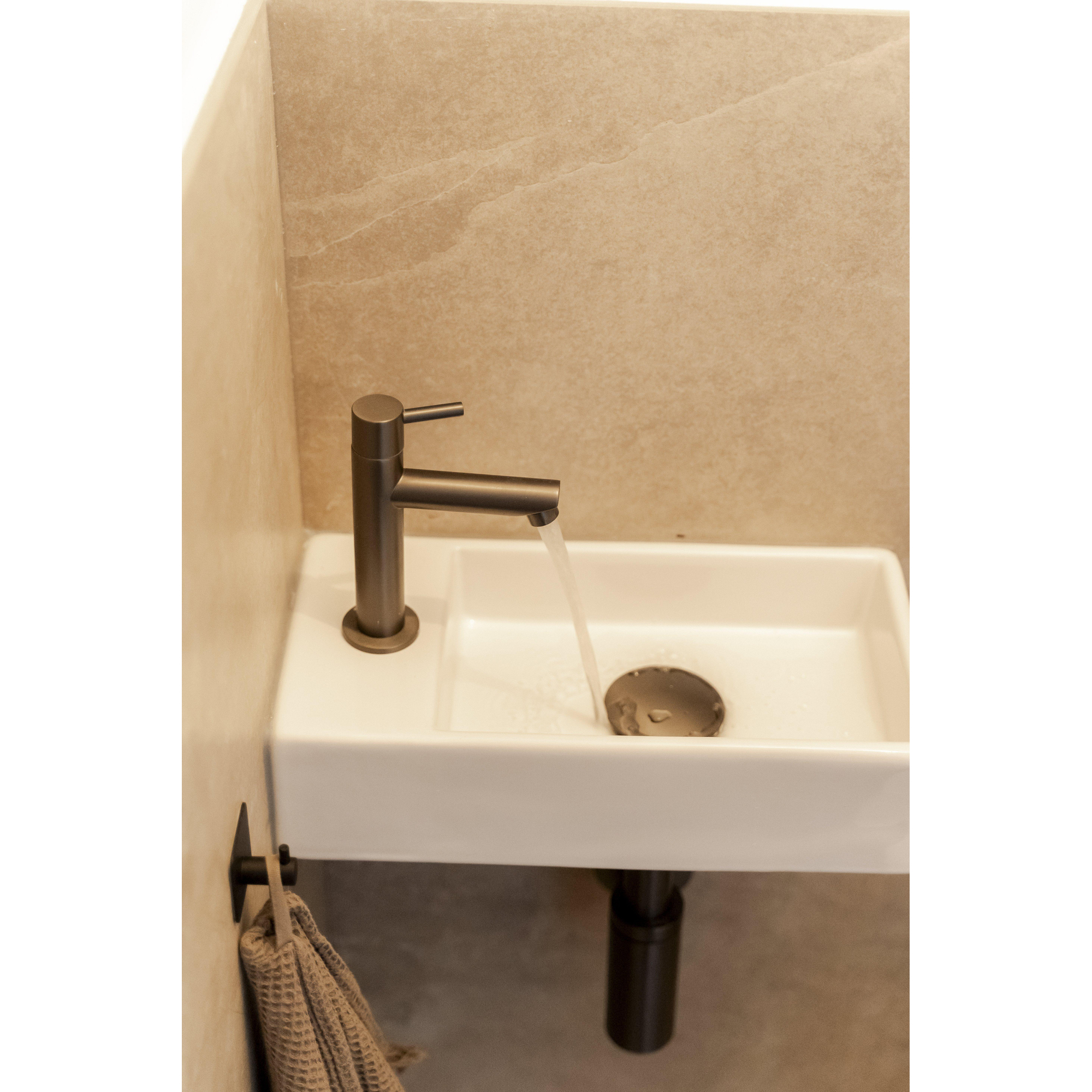 Met zijn hoogwaardige materialen en afwerking straalt de Fortifura Calvi Fonteinkraan een gevoel van luxe uit. Het gebruik van PVD geborsteld gunmetal zorgt niet alleen voor een elegante uitstraling, maar garandeert ook duurzaamheid en langdurige glans. Deze fonteinkraan voegt een vleugje luxe toe aan elke badkamer en creëert een spa-achtige sfeer.