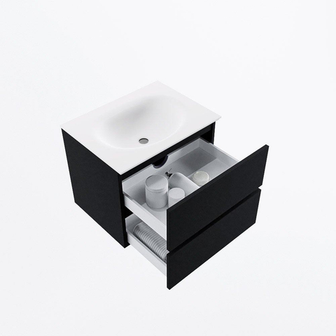 Naast zijn esthetische waarde is dit badmeubel ook uiterst functioneel. Met twee ruime lades biedt het voldoende opbergruimte voor al je badkamerbenodigdheden, van handdoeken tot toiletartikelen. De praktische indeling zorgt ervoor dat alles georganiseerd en binnen handbereik is, waardoor je badkamer netjes en opgeruimd blijft.