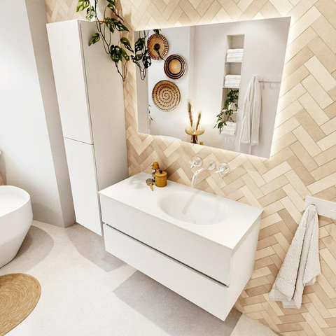 MONDIAZ VICA 100cm badmeubel onderkast Talc 2 lades. Wastafel MOON rechts zonder kraangat, kleur Talc.