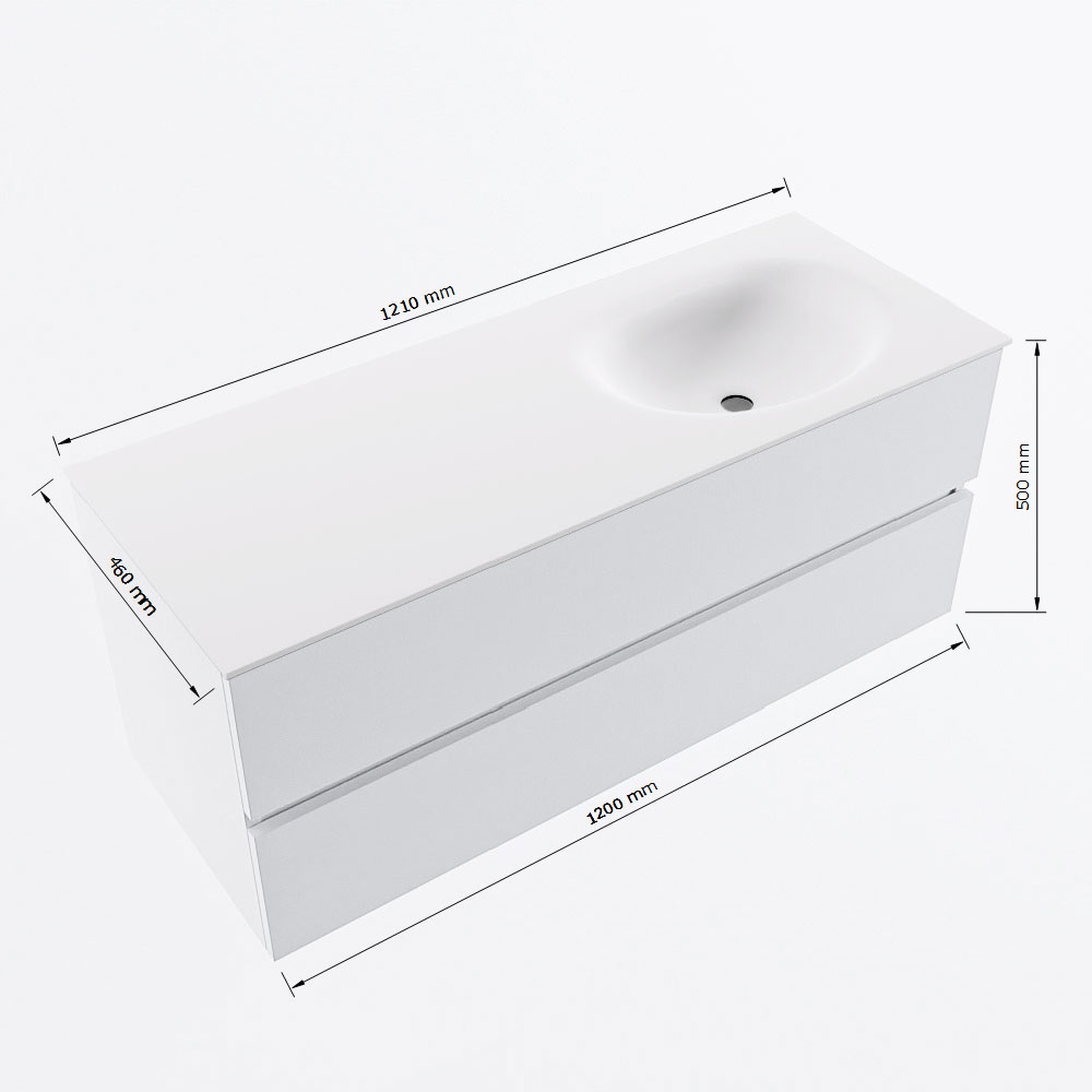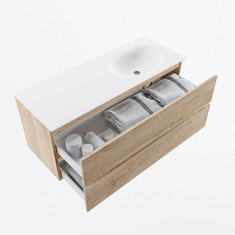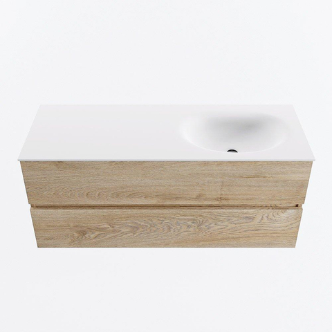 MONDIAZ VICA 120cm badmeubel onderkast Washed Oak 2 lades. Wastafel MOON rechts zonder kraangat, kleur Talc.