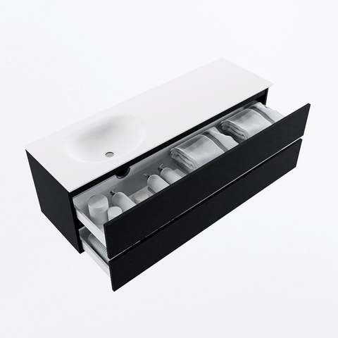 Dit badmeubel is niet alleen mooi, maar ook uiterst functioneel. De twee ruime lades zijn voorzien van soft-close technologie, waardoor ze geruisloos sluiten en je spullen beschermd blijven. De wastafel met één kraangat aan de linkerkant biedt voldoende ruimte voor dagelijkse verzorging. Het geheel is vervaardigd van hoogwaardige materialen die bestand zijn tegen vocht en slijtage, waardoor dit badmeubel lang meegaat en zijn kwaliteit behoudt.
