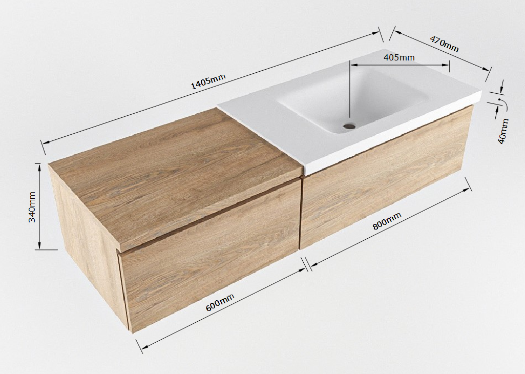 MONDIAZ BUKLA 140cm badmeubel met module 60 kleur Washed Oak met 2 lades. Wastafel CLOUD rechts 0 kraangaten kleur Talc.