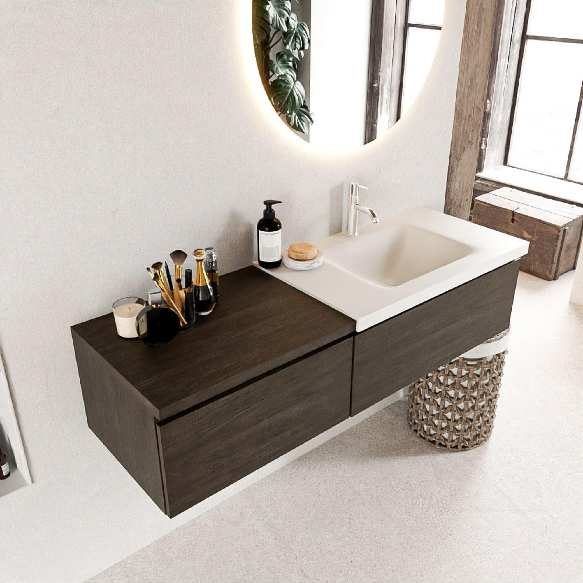 MONDIAZ BUKLA 140cm badmeubel met module 60 kleur Dark Brown met 2 lades. Wastafel CLOUD rechts 1 kraangat kleur Talc.