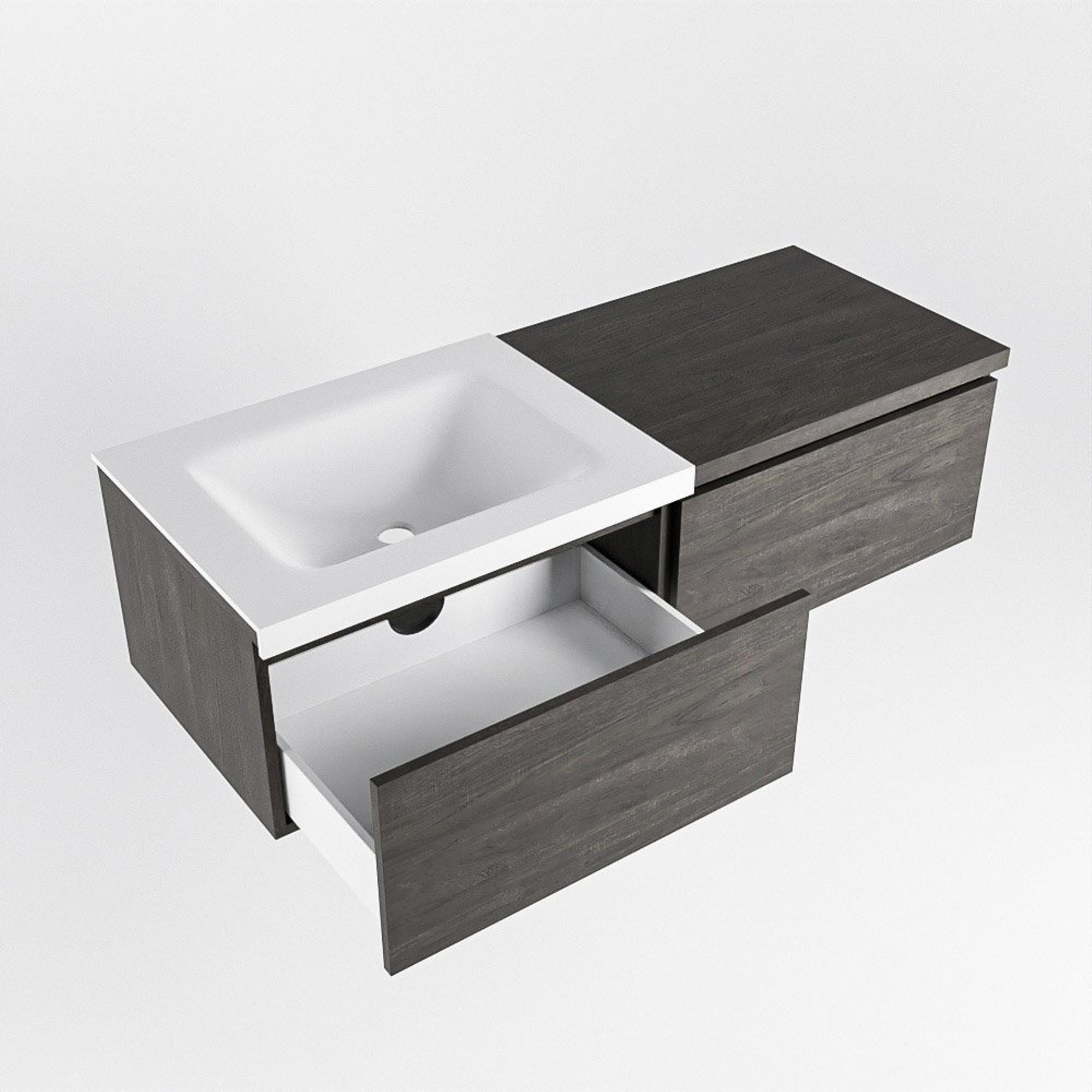 Dit badmeubel straalt luxe uit in elke centimeter. De Dark Brown kleur geeft een warme en uitnodigende uitstraling aan de badkamer, terwijl de 2 lades zorgen voor voldoende opbergruimte voor al jouw badkamerbenodigdheden. De wastafel CLOUD links met 1 kraangat in de kleur Talc voegt een vleugje elegantie toe aan het geheel, waardoor jouw badkamer een chique uitstraling krijgt.