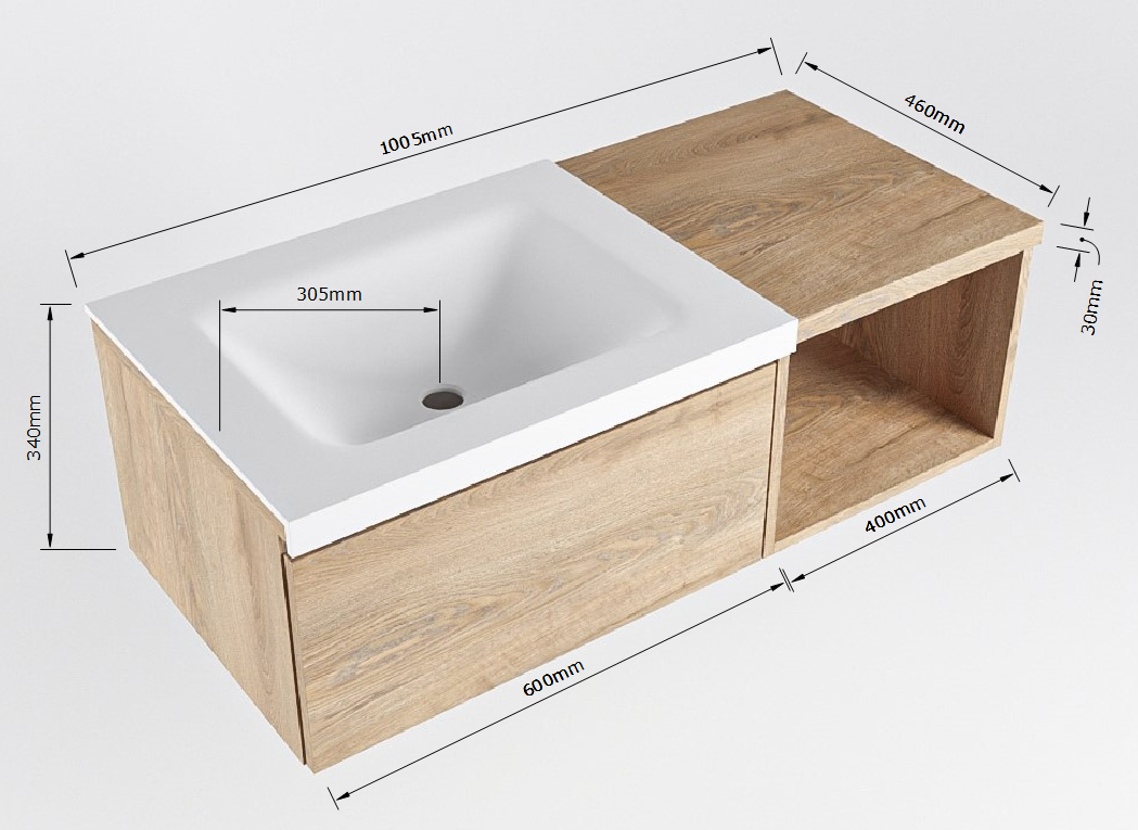 Dit badmeubel is niet alleen mooi, maar ook zeer functioneel. De handige lade zorgt voor een opgeruimde badkamer en de wastafel met 0 kraangaten biedt ruimte voor jouw favoriete kraan. De MONDIAZ BUKLA 100cm badmeubel met open module en Wastafel CLOUD links is ontworpen met oog voor detail en gebruiksgemak.